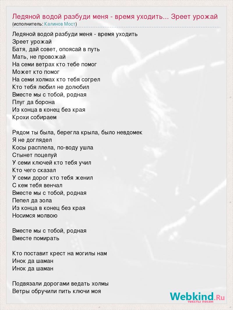 Ледяной водой разбуди меня - время уходить Зреет урожай Батя, дай совет, опоясай в путь Мать, не провожай На семи ветрах кто тебе помог Может кто помог На семи холмах кто тебя согрел Кто тебя любил не долюбил Вместе мы с тобой, родная Плуг да борона Из конца в конец без края Крохи собираем Рядом ты была, берегла крыла, было невдомек Я не доглядел Косы расплела, по-воду ушла Стынет поцелуй У семи ключей кто тебя учил Кто чего сказал У семи дорог кто тебя женил С кем тебя венчал Вместе мы с тобой, родная Пепел да зола Из конца в конец без края Носимся молвою Вместе мы с тобой, родная Вместе помирать Кто поставит крест на могилы нам Инок да шаман Инок да шаман Подвязали дорогами ведать холмы Ветры обручили пить ключи моя