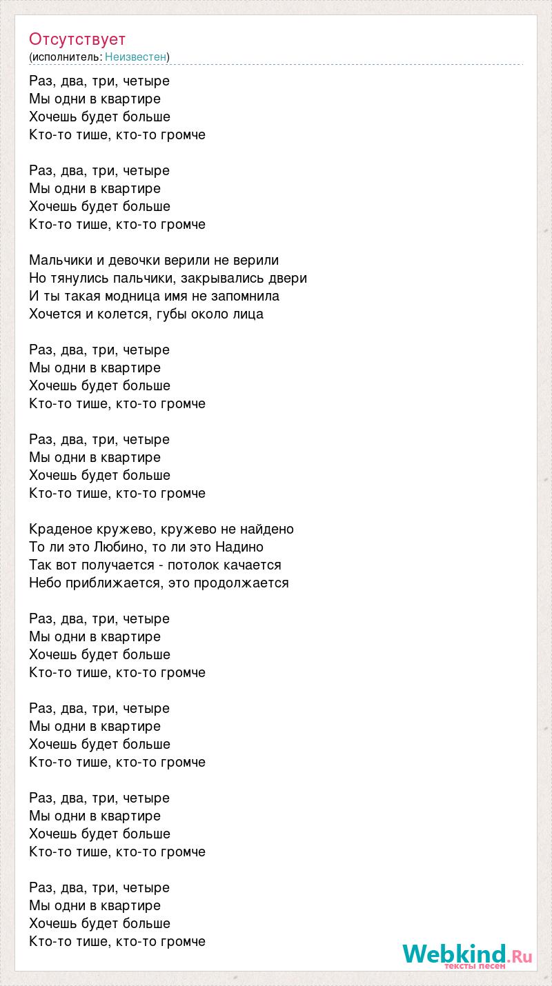 Раз, два, три, четыре Мы одни в квартире Хочешь будет больше Кто-то тише, кто-то громче Раз, два, три, четыре Мы одни в квартире Хочешь будет больше Кто-то тише, кто-то громче Мальчики и девочки верили не верили Но тянулись пальчики, закрывались двери И ты такая модница имя не запомнила Хочется и колется, губы около лица Раз, два, три, четыре Мы одни в квартире Хочешь будет больше Кто-то тише, кто-то громче Раз, два, три, четыре Мы одни в квартире Хочешь будет больше Кто-то тише, кто-то громче Краденое кружево, кружево не найдено То ли это Любино, то ли это Надино Так вот получается - потолок качается Небо приближается, это продолжается Раз, два, три, четыре Мы одни в квартире Хочешь будет больше Кто-то тише, кто-то громче Раз, два, три, четыре Мы одни в квартире Хочешь будет больше Кто-то тише, кто-то громче Раз, два, три, четыре Мы одни в квартире Хочешь будет больше Кто-то тише, кто-то громче Раз, два, три, четыре Мы одни в квартире Хочешь будет больше Кто-то тише, кто-то громче