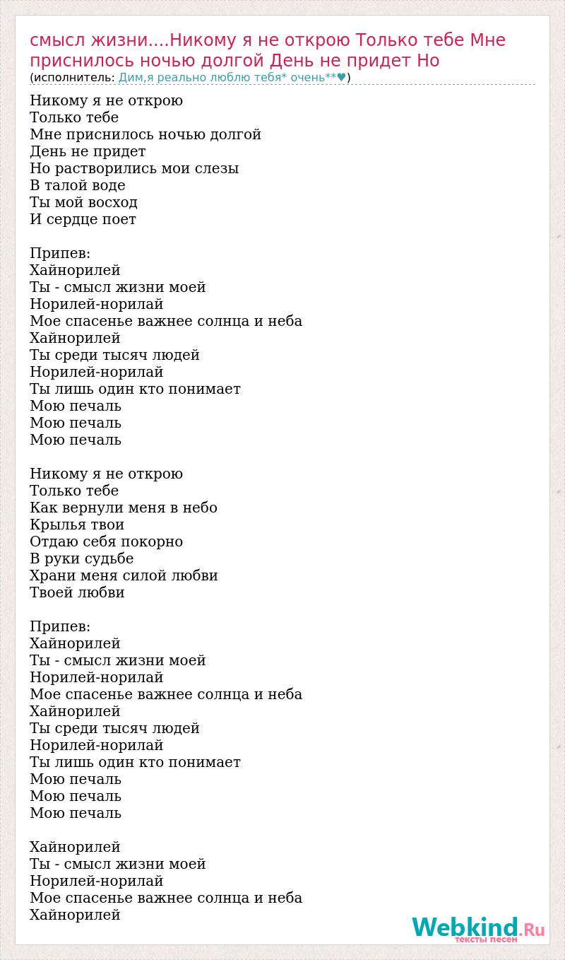 Никому я не открою Только тебе Мне приснилось ночью долгой День не придет Но растворились мои слезы В талой воде Ты мой восход И сердце поет Припев: Хайнорилей Ты - смысл жизни моей Норилей-норилай Мое спасенье важнее солнца и неба Хайнорилей Ты среди тысяч людей Норилей-норилай Ты лишь один кто понимает Мою печаль Мою печаль Мою печаль Никому я не открою Только тебе Как вернули меня в небо Крылья твои Отдаю себя покорно В руки судьбе Храни меня силой любви Твоей любви Припев: Хайнорилей Ты - смысл жизни моей Норилей-норилай Мое спасенье важнее солнца и неба Хайнорилей Ты среди тысяч людей Норилей-норилай Ты лишь один кто понимает Мою печаль Мою печаль Мою печаль Хайнорилей Ты - смысл жизни моей Норилей-норилай Мое спасенье важнее солнца и неба Хайнорилей