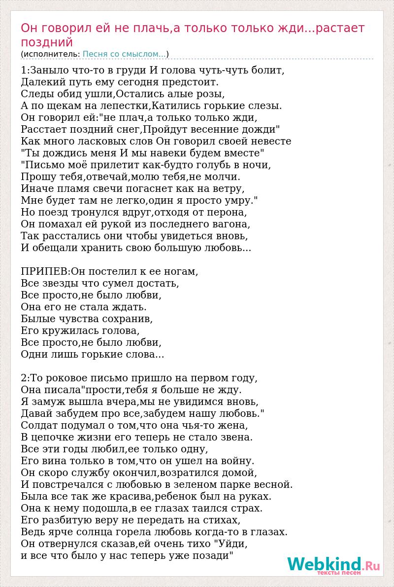 Главная→Исполнители→Песня со смыслом...→Он говорил ей не плачь,а только только жди...растает поздний