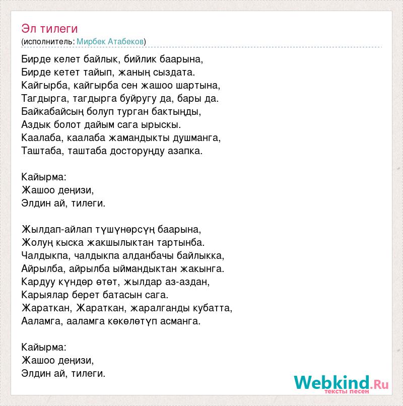 Бирде келет байлык, бийлик баарына, Бирде кетет тайып, жаның сыздата. Кайгырба, кайгырба сен жашоо шартына, Тагдырга, тагдырга буйругу да, бары да. Байкабайсың болуп турган бактыңды, Аздык болот дайым сага ырыскы. Каалаба, каалаба жамандыкты душманга, Таштаба, таштаба досторуңду азапка. Кайырма: Жашоо деңизи, Элдин ай, тилеги. Жылдап-айлап түшүнөрсүң баарына, Жолуң кыска жакшылыктан тартынба. Чалдыкпа, чалдыкпа алданбачы байлыкка, Айрылба, айрылба ыймандыктан жакынга. Кардуу күндөр өтөт, жылдар аз-аздан, Карыялар берет батасын сага. Жараткан, Жараткан, жаралганды кубатта, Ааламга, ааламга көкөлөтүп асманга. Кайырма: Жашоо деңизи, Элдин ай, тилеги.