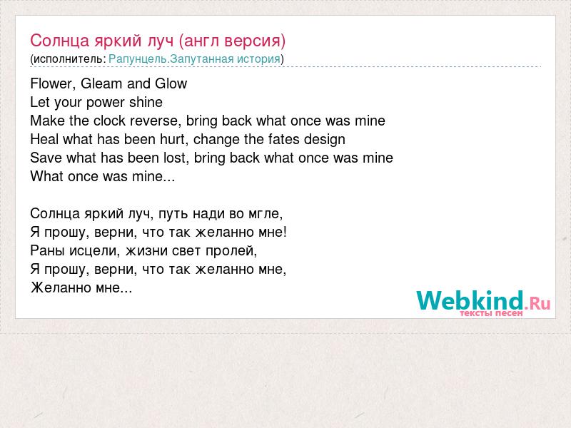 Flower, Gleam and Glow Let your power shine Make the clock reverse, bring back what once was mine Heal what has been hurt, change the fates design Save what has been lost, bring back what once was mine What once was mine... Солнца яркий луч, путь нади во мгле, Я прошу, верни, что так желанно мне! Раны исцели, жизни свет пролей, Я прошу, верни, что так желанно мне, Желанно мне...