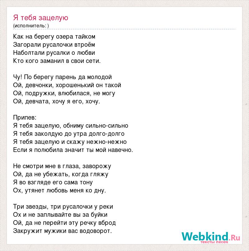 Как на берегу озера тайком Загорали русалочки втроём Наболтали русалки о любви Кто кого заманил в свои сети. Чу! По берегу парень да молодой Ой, девчонки, хорошенький он такой Ой, подружки, влюбилася, не могу Ой, девчата, хочу я его, хочу. Припев: Я тебя зацелую, обниму сильно-сильно Я тебя заколдую до утра долго-долго Я тебя зацелую и скажу нежно-нежно Если я полюбила значит ты мой навечно. Не смотри мне в глаза, заворожу Ой, да не убежать, когда гляжу Я во взгляде его сама тону Ох, утянет любовь меня ко дну. Три звезды, три русалочки у реки Ох и не заплывайте вы за буйки Ой, да не перейти эту речку вброд Закружит мужики вас водоворот.