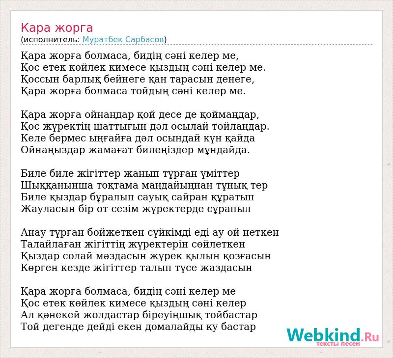 Қара жорға болмаса, бидің сәні келер ме, Қос етек көйлек кимесе қыздың сәні келер ме. Қоссын барлық бейнеге қан тарасын денеге, Қара жорға болмаса тойдың сәні келер ме. Қара жорға ойнаңдар қой десе де қоймаңдар, Қос жүректің шаттығын дәл осылай тойлаңдар. Келе бермес ыңғайға дәл осындай күн қайда Ойнаңыздар жамағат билеңіздер мұндайда. Биле биле жігіттер жанып тұрған үміттер Шыққанынша тоқтама маңдайыңнан тұнық тер Биле қыздар бұралып сауық сайран құратып Жауласын бір от сезім жүректерде сұрапыл Анау тұрған бойжеткен сүйкімді еді ау ой неткен Талайлаған жігіттің жүректерін сөйлеткен Қыздар солай мәздасын жүрек қылын қозғасын Көрген кезде жігіттер талып түсе жаздасын Қара жорға болмаса, бидің сәні келер ме Қос етек көйлек кимесе қыздың сәні келер Ал қәнекей жолдастар біреуіңшық тойбастар Той дегенде дейді екен домалайды қу бастар
