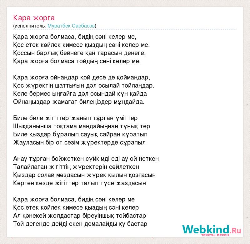 Қара жорға болмаса, бидің сәні келер ме, Қос етек көйлек кимесе қыздың сәні келер ме. Қоссын барлық бейнеге қан тарасын денеге, Қара жорға болмаса тойдың сәні келер ме. Қара жорға ойнаңдар қой десе де қоймаңдар, Қос жүректің шаттығын дәл осылай тойлаңдар. Келе бермес ыңғайға дәл осындай күн қайда Ойнаңыздар жамағат билеңіздер мұндайда. Биле биле жігіттер жанып тұрған үміттер Шыққанынша тоқтама маңдайыңнан тұнық тер Биле қыздар бұралып сауық сайран құратып Жауласын бір от сезім жүректерде сұрапыл Анау тұрған бойжеткен сүйкімді еді ау ой неткен Талайлаған жігіттің жүректерін сөйлеткен Қыздар солай мәздасын жүрек қылын қозғасын Көрген кезде жігіттер талып түсе жаздасын Қара жорға болмаса, бидің сәні келер ме Қос етек көйлек кимесе қыздың сәні келер Ал қәнекей жолдастар біреуіңшық тойбастар Той дегенде дейді екен домалайды қу бастар