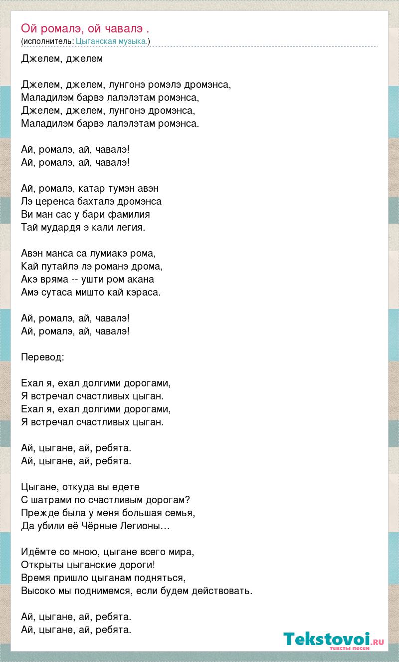 Джелем, джелем Джелем, джелем, лунгонэ ромэлэ дромэнса, Маладилэм барвэ лалэлэтам ромэнса, Джелем, джелем, лунгонэ дромэнса, Маладилэм барвэ лалэлэтам ромэнса. Ай, ромалэ, ай, чавалэ! Ай, ромалэ, ай, чавалэ! Ай, ромалэ, катар тумэн авэн Лэ церенса бахталэ дромэнса Ви ман сас у бари фамилия Тай мудардя э кали легия. Авэн манса са лумиакэ рома, Кай путайлэ лэ романэ дрома, Акэ вряма -- ушти ром акана Амэ сутаса мишто кай кэраса. Ай, ромалэ, ай, чавалэ! Ай, ромалэ, ай, чавалэ! Перевод: Ехал я, ехал долгими дорогами, Я встречал счастливых цыган. Ехал я, ехал долгими дорогами, Я встречал счастливых цыган. Ай, цыгане, ай, ребята. Ай, цыгане, ай, ребята. Цыгане, откуда вы едете С шатрами по счастливым дорогам? Прежде была у меня большая семья, Да убили её Чёрные Легионы… Идёмте со мною, цыгане всего мира, Открыты цыганские дороги! Время пришло цыганам подняться, Высоко мы поднимемся, если будем действовать. Ай, цыгане, ай, ребята. Ай, цыгане, ай, ребята.