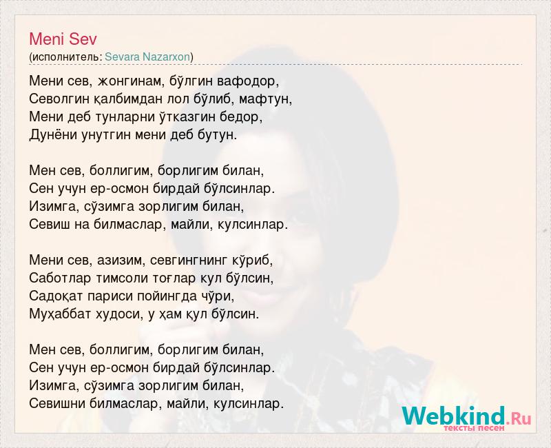 Мени сев, жонгинам, бўлгин вафодор, Севолгин қалбимдан лол бўлиб, мафтун, Мени деб тунларни ўтказгин бедор, Дунёни унутгин мени деб бутун. Мен сев, боллигим, борлигим билан, Сен учун ер-осмон бирдай бўлсинлар. Изимга, сўзимга зорлигим билан, Севиш на билмаслар, майли, кулсинлар. Мени сев, азизим, севгингнинг кўриб, Саботлар тимсоли тоғлар кул бўлсин, Садоқат париси пойингда чўри, Муҳаббат худоси, у ҳам қул бўлсин. Мен сев, боллигим, борлигим билан, Сен учун ер-осмон бирдай бўлсинлар. Изимга, сўзимга зорлигим билан, Севишни билмаслар, майли, кулсинлар.