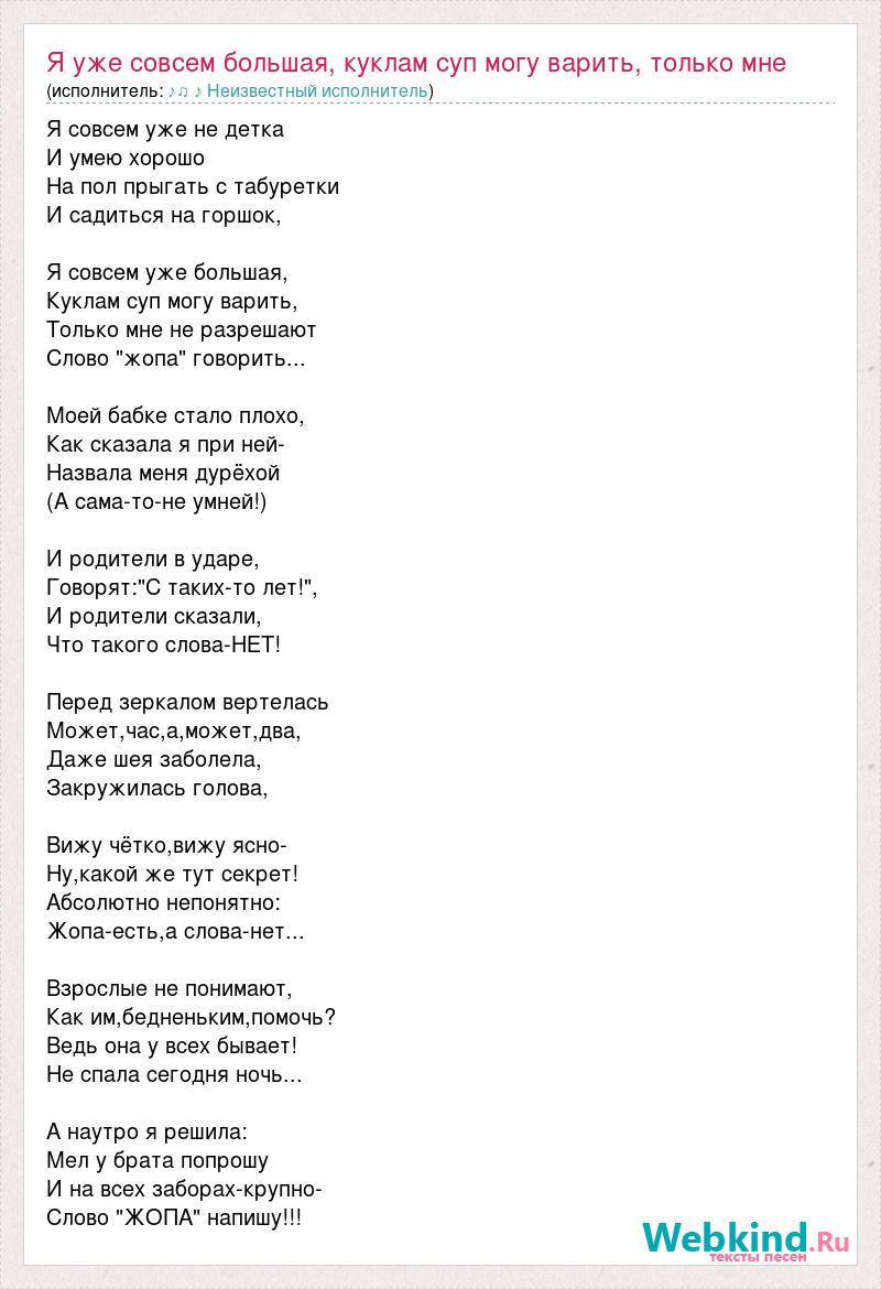 А как ты думаешь, о чем песня "Я уже совсем большая, куклам суп могу варить, только мне не разрешают, слово жоп" ?