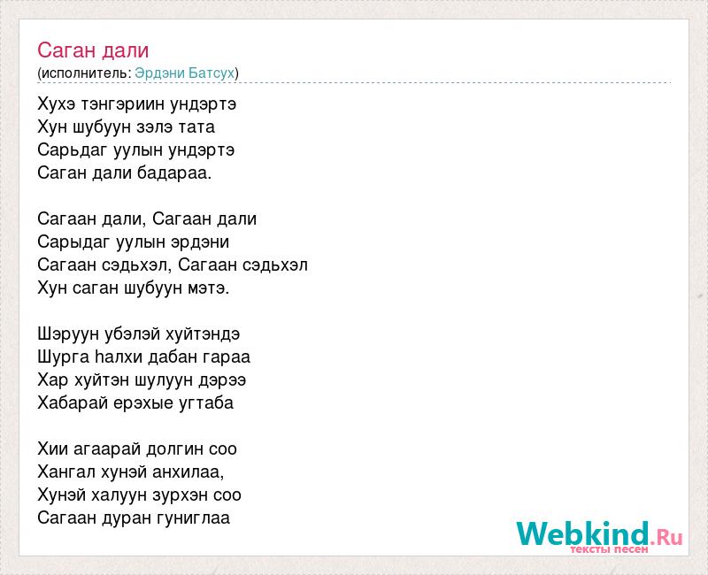 Хухэ тэнгэриин ундэртэ Хун шубуун зэлэ тата Сарьдаг уулын ундэртэ Саган дали бадараа. Сагаан дали, Сагаан дали Сарыдаг уулын эрдэни Сагаан сэдьхэл, Сагаан сэдьхэл Хун саган шубуун мэтэ. Шэруун убэлэй хуйтэндэ Шурга hалхи дабан гараа Хар хуйтэн шулуун дэрээ Хабарай ерэхые угтаба Хии агаарай долгин соо Хангал хунэй анхилаа, Хунэй халуун зурхэн соо Сагаан дуран гуниглаа