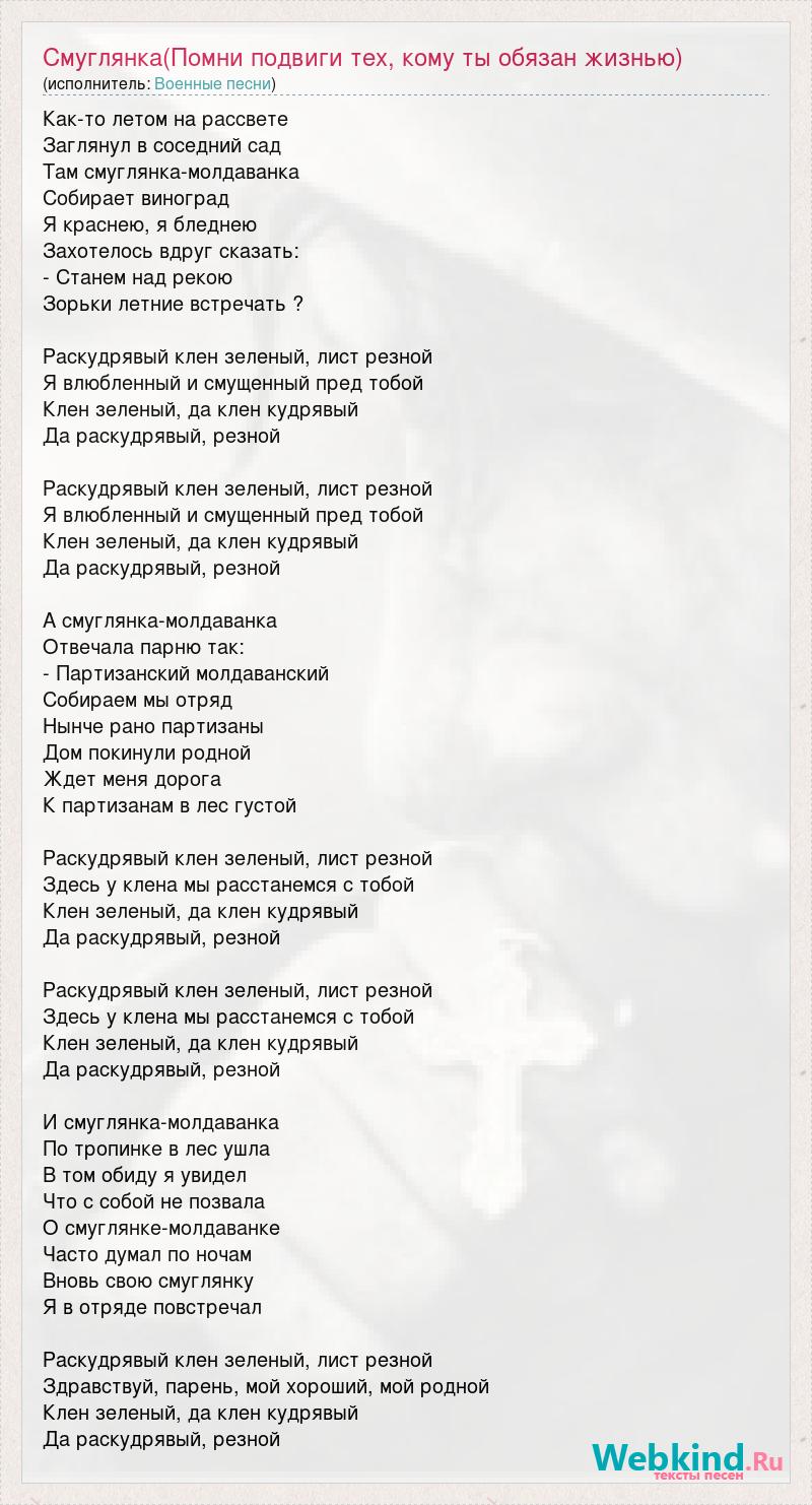 Как-то летом на рассвете Заглянул в соседний сад Там смуглянка-молдаванка Собирает виноград Я краснею, я бледнею Захотелось вдруг сказать: - Станем над рекою Зорьки летние встречать ? Раскудрявый клен зеленый, лист резной Я влюбленный и смущенный пред тобой Клен зеленый, да клен кудрявый Да раскудрявый, резной Раскудрявый клен зеленый, лист резной Я влюбленный и смущенный пред тобой Клен зеленый, да клен кудрявый Да раскудрявый, резной А смуглянка-молдаванка Отвечала парню так: - Партизанский молдаванский Собираем мы отряд Нынче рано партизаны Дом покинули родной Ждет меня дорога К партизанам в лес густой Раскудрявый клен зеленый, лист резной Здесь у клена мы расстанемся с тобой Клен зеленый, да клен кудрявый Да раскудрявый, резной Раскудрявый клен зеленый, лист резной Здесь у клена мы расстанемся с тобой Клен зеленый, да клен кудрявый Да раскудрявый, резной И смуглянка-молдаванка По тропинке в лес ушла В том обиду я увидел Что с собой не позвала О смуглянке-молдаванке Часто думал по ночам Вновь свою смуглянку Я в отряде повстречал Раскудрявый клен зеленый, лист резной Здравствуй, парень, мой хороший, мой родной Клен зеленый, да клен кудрявый Да раскудрявый, резной