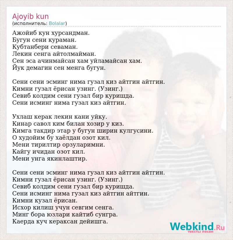 Ажойиб кун хурсандман. Бугун сени кураман. Кубтанбери севаман. Лекин сенга айтолмайман. Сен эса ачинмайсан хам уйламайсан хам. Йук демагин сен менга бугун. Сени сени эсминг нима гузал киз айтгин айтгин. Кимни гузал ёрисан узинг. (Узинг.) Севиб колдим сени гузал бир куришда. Сени исминг нима гузал киз айтгин. Ухлаш керак лекин кани уйку. Кинар савол ким билан хозир у киз. Кимга такдир этар у бугун ширин кулгусини. О худойим бу хаёлдан озот кил. Мени тирилтир орзуларимни. Кайгу ичидан озот кил. Мени унга якинлаштир. Сени сени эсминг нима гузал киз айтгин айтгин. Кимни гузал ёрисан узинг. (Узинг.) Севиб колдим сени гузал бир куришда. Сени исминг нима гузал киз айтгин айтгин. Кимни кузал ёрисан. Исхор килиш учун севгим сенга. Минг бора юзлари кайтиб сунгра. Каерда куч кераксан дейишга.