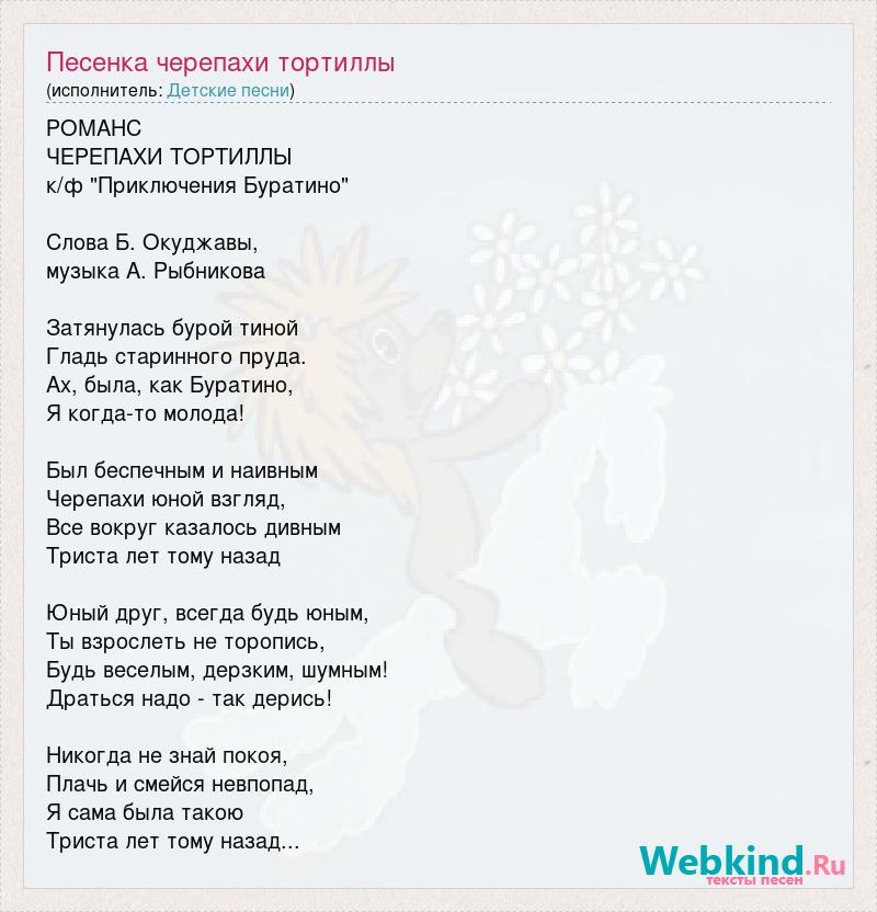 РОМАНС ЧЕРЕПАХИ ТОРТИЛЛЫ к/ф "Приключения Буратино" Слова Б. Окуджавы, музыка А. Рыбникова Затянулась бурой тиной Гладь старинного пруда. Ах, была, как Буратино, Я когда-то молода! Был беспечным и наивным Черепахи юной взгляд, Все вокруг казалось дивным Триста лет тому назад Юный друг, всегда будь юным, Ты взрослеть не торопись, Будь веселым, дерзким, шумным! Драться надо - так дерись! Никогда не знай покоя, Плачь и смейся невпопад, Я сама была такою Триста лет тому назад...