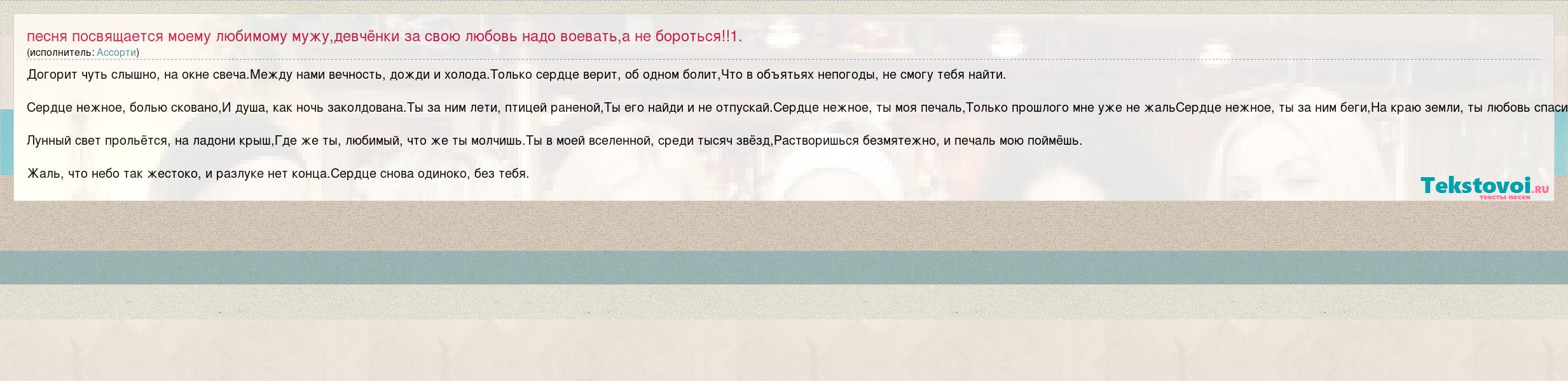 Главная→Исполнители→Ассорти→Песня посвящается моему любимому мужу,девчёнки за свою любовь надо воевать,а не