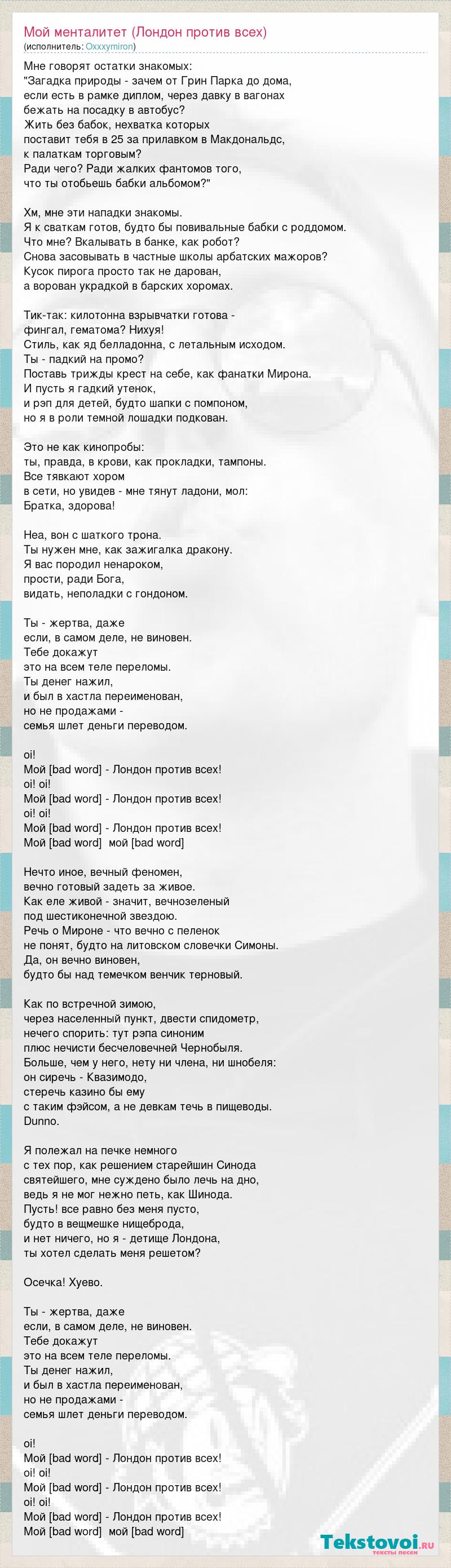 Мне говорят остатки знакомых: "Загадка природы - зачем от Грин Парка до дома, если есть в рамке диплом, через давку в вагонах бежать на посадку в автобус? Жить без бабок, нехватка которых поставит тебя в 25 за прилавком в Макдональдс, к палаткам торговым? Ради чего? Ради жалких фантомов того, что ты отобьешь бабки альбомом?" Хм, мне эти нападки знакомы. Я к сваткам готов, будто бы повивальные бабки с роддомом. Что мне? Вкалывать в банке, как робот? Снова засовывать в частные школы арбатских мажоров? Кусок пирога просто так не дарован, а ворован украдкой в барских хоромах. Тик-так: килотонна взрывчатки готова - фингал, гематома? Нихуя! Стиль, как яд белладонна, с летальным исходом. Ты - падкий на промо? Поставь трижды крест на себе, как фанатки Мирона. И пусть я гадкий утенок, и рэп для детей, будто шапки с помпоном, но я в роли темной лошадки подкован. Это не как кинопробы: ты, правда, в крови, как прокладки, тампоны. Все тявкают хором в сети, но увидев - мне тянут ладони, мол: Братка, здорова! Неа, вон с шаткого трона. Ты нужен мне, как зажигалка дракону. Я вас породил ненароком, прости, ради Бога, видать, неполадки с гондоном. Ты - жертва, даже если, в самом деле, не виновен. Тебе докажут это на всем теле переломы. Ты денег нажил, и был в хастла переименован, но не продажами - семья шлет деньги переводом. oi! Мой [bad word] - Лондон против всех! oi! oi! Мой [bad word] - Лондон против всех! oi! oi! Мой [bad word] - Лондон против всех! Мой [bad word] мой [bad word] Нечто иное, вечный феномен, вечно готовый задеть за живое. Как еле живой - значит, вечнозеленый под шестиконечной звездою. Речь о Мироне - что вечно с пеленок не понят, будто на литовском словечки Симоны. Да, он вечно виновен, будто бы над темечком венчик терновый. Как по встречной зимою, через населенный пункт, двести спидометр, нечего спорить: тут рэпа синоним плюс нечисти бесчеловечней Чернобыля. Больше, чем у него, нету ни члена, ни шнобеля: он сиречь - Квазимодо, стеречь казино бы ему с таким фэйсом, а не девкам течь в пищеводы. Dunno. Я полежал на печке немного с тех пор, как решением старейшин Синода святейшего, мне суждено было лечь на дно, ведь я не мог нежно петь, как Шинода. Пусть! все равно без меня пусто, будто в вещмешке нищеброда, и нет ничего, но я - детище Лондона, ты хотел сделать меня решетом? Осечка! Хуево. Ты - жертва, даже если, в самом деле, не виновен. Тебе докажут это на всем теле переломы. Ты денег нажил, и был в хастла переименован, но не продажами - семья шлет деньги переводом. oi! Мой [bad word] - Лондон против всех! oi! oi! Мой [bad word] - Лондон против всех! oi! oi! Мой [bad word] - Лондон против всех! Мой [bad word] мой [bad word]