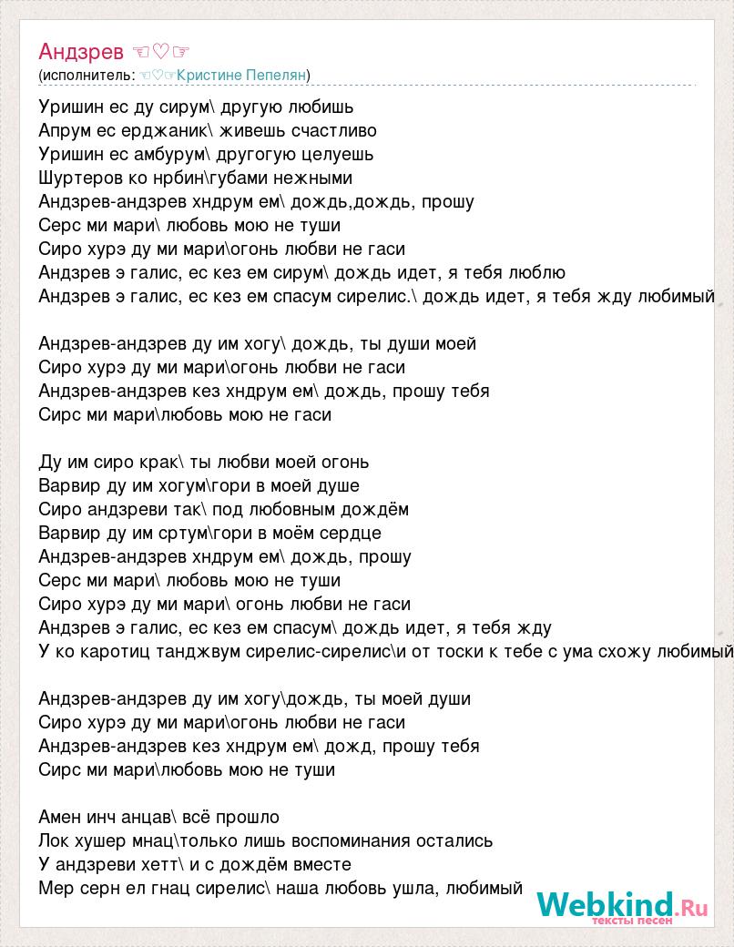 Уришин ес ду сирум\ другую любишь Апрум ес ерджаник\ живешь счастливо Уришин ес амбурум\ другогую целуешь Шуртеров ко нрбин\губами нежными Андзрев-андзрев хндрум ем\ дождь,дождь, прошу Серс ми мари\ любовь мою не туши Сиро хурэ ду ми мари\огонь любви не гаси Андзрев э галис, ес кез ем сирум\ дождь идет, я тебя люблю Андзрев э галис, ес кез ем спасум сирелис.\ дождь идет, я тебя жду любимый Андзрев-андзрев ду им хогу\ дождь, ты души моей Сиро хурэ ду ми мари\огонь любви не гаси Андзрев-андзрев кез хндрум ем\ дождь, прошу тебя Сирс ми мари\любовь мою не гаси Ду им сиро крак\ ты любви моей огонь Варвир ду им хогум\гори в моей душе Сиро андзреви так\ под любовным дождём Варвир ду им сртум\гори в моём сердце Андзрев-андзрев хндрум ем\ дождь, прошу Серс ми мари\ любовь мою не туши Сиро хурэ ду ми мари\ огонь любви не гаси Андзрев э галис, ес кез ем спасум\ дождь идет, я тебя жду У ко каротиц танджвум сирелис-сирелис\и от тоски к тебе с ума схожу любимый Андзрев-андзрев ду им хогу\дождь, ты моей души Сиро хурэ ду ми мари\огонь любви не гаси Андзрев-андзрев кез хндрум ем\ дожд, прошу тебя Сирс ми мари\любовь мою не туши Амен инч анцав\ всё прошло Лок хушер мнац\только лишь воспоминания остались У андзреви хетт\ и с дождём вместе Мер серн ел гнац сирелис\ наша любовь ушла, любимый