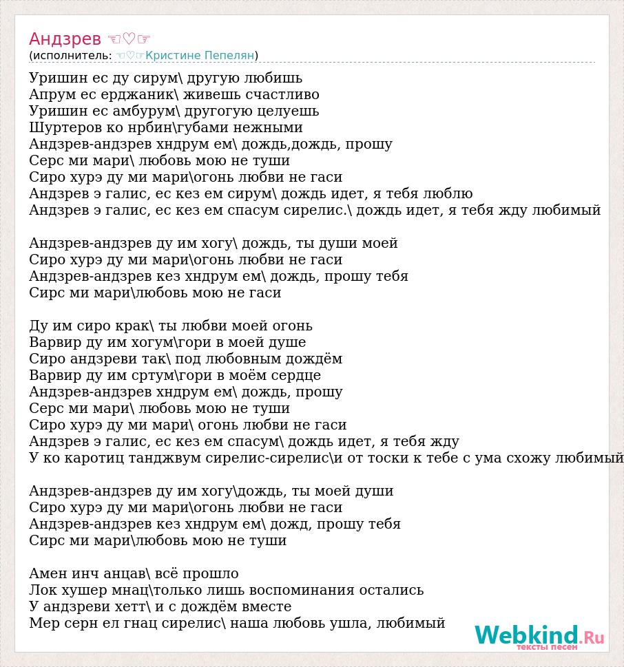 Уришин ес ду сирум\ другую любишь Апрум ес ерджаник\ живешь счастливо Уришин ес амбурум\ другогую целуешь Шуртеров ко нрбин\губами нежными Андзрев-андзрев хндрум ем\ дождь,дождь, прошу Серс ми мари\ любовь мою не туши Сиро хурэ ду ми мари\огонь любви не гаси Андзрев э галис, ес кез ем сирум\ дождь идет, я тебя люблю Андзрев э галис, ес кез ем спасум сирелис.\ дождь идет, я тебя жду любимый Андзрев-андзрев ду им хогу\ дождь, ты души моей Сиро хурэ ду ми мари\огонь любви не гаси Андзрев-андзрев кез хндрум ем\ дождь, прошу тебя Сирс ми мари\любовь мою не гаси Ду им сиро крак\ ты любви моей огонь Варвир ду им хогум\гори в моей душе Сиро андзреви так\ под любовным дождём Варвир ду им сртум\гори в моём сердце Андзрев-андзрев хндрум ем\ дождь, прошу Серс ми мари\ любовь мою не туши Сиро хурэ ду ми мари\ огонь любви не гаси Андзрев э галис, ес кез ем спасум\ дождь идет, я тебя жду У ко каротиц танджвум сирелис-сирелис\и от тоски к тебе с ума схожу любимый Андзрев-андзрев ду им хогу\дождь, ты моей души Сиро хурэ ду ми мари\огонь любви не гаси Андзрев-андзрев кез хндрум ем\ дожд, прошу тебя Сирс ми мари\любовь мою не туши Амен инч анцав\ всё прошло Лок хушер мнац\только лишь воспоминания остались У андзреви хетт\ и с дождём вместе Мер серн ел гнац сирелис\ наша любовь ушла, любимый