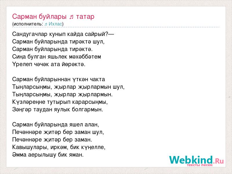 Сандугачлар кунып кайда сайрый?— Сарман буйларында тирәктә шул, Сарман буйларында тирәктә. Сиңа булган яшьлек мәхәббәтем Үрелеп чәчәк ата йөрәктә. Сарман буйларыннан үткән чакта Тыңларсыңмы, җырлар җырлармын шул, Тыңларсыңмы, җырлар җырлармын. Күзләреңне тутырып карарсыңмы, Зәңгәр таудан яулык болгармын. Сарман буйларында яшел алан, Печәннәре җитәр бер заман шул, Печәннәре җитәр бер заман. Кавышулары, иркәм, бик күңелле, Әмма аерылышу бик яман.