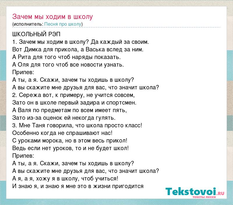 ШКОЛЬНЫЙ РЭП 1. Зачем мы ходим в школу? Да каждый за своим. Вот Димка для прикола, а Васька вслед за ним. А Рита для того чтоб наряды показать. А Оля для того чтоб все новости узнать. Припев: А ты, а я. Скажи, зачем ты ходишь в школу? А вы скажите мне друзья для вас, что значит школа? 2. Сережа вот, к примеру, не учится совсем, Зато он в школе первый задира и спортсмен. А Валя по предметам по всем имеет пять, Зато из-за оценок ей некогда гулять. 3. Мне Таня говорила, что школа просто класс! Особенно когда не спрашивают нас! С уроками морока, но в этом весь прикол! Ведь если нет уроков, то и не будет школ! Припев: А ты, а я. Скажи, зачем ты ходишь в школу? А вы скажите мне друзья для вас, что значит школа? А я, а я, хожу я в школу, чтоб учиться! И знаю я, и знаю я мне это в жизни пригодится