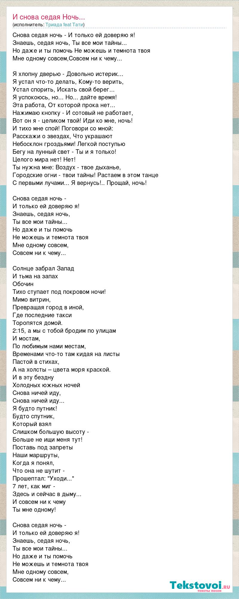 Снова седая ночь - И только ей доверяю я! Знаешь, седая ночь, Ты все мои тайны... Но даже и ты помочь Не можешь и темнота твоя Мне одному совсем,Совсем ни к чему... Я хлопну дверью - Довольно истерик... Я устал что-то делать, Кому-то верить, Устал спорить, Искать свой берег... Я успокоюсь, но... Но... дайте время! Эта работа, От которой прока нет... Нажимаю кнопку - И сотовый не работает, Вот он я - целиком твой! Иди ко мне, ночь! И тихо мне спой! Поговори со мной: Расскажи о звездах, Что украшают Небосклон гроздьями! Легкой поступью Бегу на лунный свет - Ты и я только! Целого мира нет! Нет! Ты нужна мне: Воздух - твое дыханье, Городские огни - твои тайны! Растаем в этом танце С первыми лучами... Я вернусь!.. Прощай, ночь! Снова седая ночь - И только ей доверяю я! Знаешь, седая ночь, Ты все мои тайны... Но даже и ты помочь Не можешь и темнота твоя Мне одному совсем, Совсем ни к чему... Солнце забрал Запад И тьма на запах Обочин Тихо ступает под покровом ночи! Мимо витрин, Превращая город в иной, Где последние такси Торопятся домой. 2:15, а мы с тобой бродим по улицам И мостам, По любимым нами местам, Временами что-то там кидая на листы Пастой в стихах, А на холсты – цвета моря краской. И в эту бездну Холодных южных ночей Снова ничей иду, Снова ничей иду... Я будто путник! Будто спутник, Который взял Слишком большую высоту - Больше не ищи меня тут! Поставь под запреты Наши маршруты, Когда я понял, Что она не шутит - Прошептал: "Уходи..." 7 лет, как миг - Здесь и сейчас в дыму... И совсем ни к чему Ты мне одному! Снова седая ночь - И только ей доверяю я! Знаешь, седая ночь, Ты все мои тайны... Но даже и ты помочь Не можешь и темнота твоя Мне одному совсем, Совсем ни к чему...