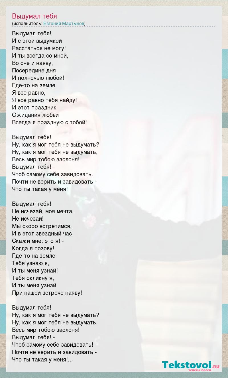 Выдумал тебя! И с этой выдумкой Расстаться не могу! И ты всегда со мной, Во сне и наяву, Посередине дня И полночью любой! Где-то на земле Я все равно, Я все равно тебя найду! И этот праздник Ожидания любви Всегда я праздную с тобой! Выдумал тебя! Ну, как я мог тебя не выдумать? Ну, как я мог тебя не выдумать, Весь мир тобою заслоня! Выдумал тебя! - Чтоб самому себе завидовать. Почти не верить и завидовать - Что ты такая у меня! Выдумал тебя! Не исчезай, моя мечта, Не исчезай! Мы скоро встретимся, И в этот звездный час Скажи мне: это я! - Когда я позову! Где-то на земле Тебя узнаю я, И ты меня узнай! Тебя окликну я, И ты меня узнай При нашей встрече наяву! Выдумал тебя! Ну, как я мог тебя не выдумать? Ну, как я мог тебя не выдумать, Весь мир тобою заслоня! Выдумал тебя! - Чтоб самому себе завидовать! Почти не верить и завидовать - Что ты такая у меня!...