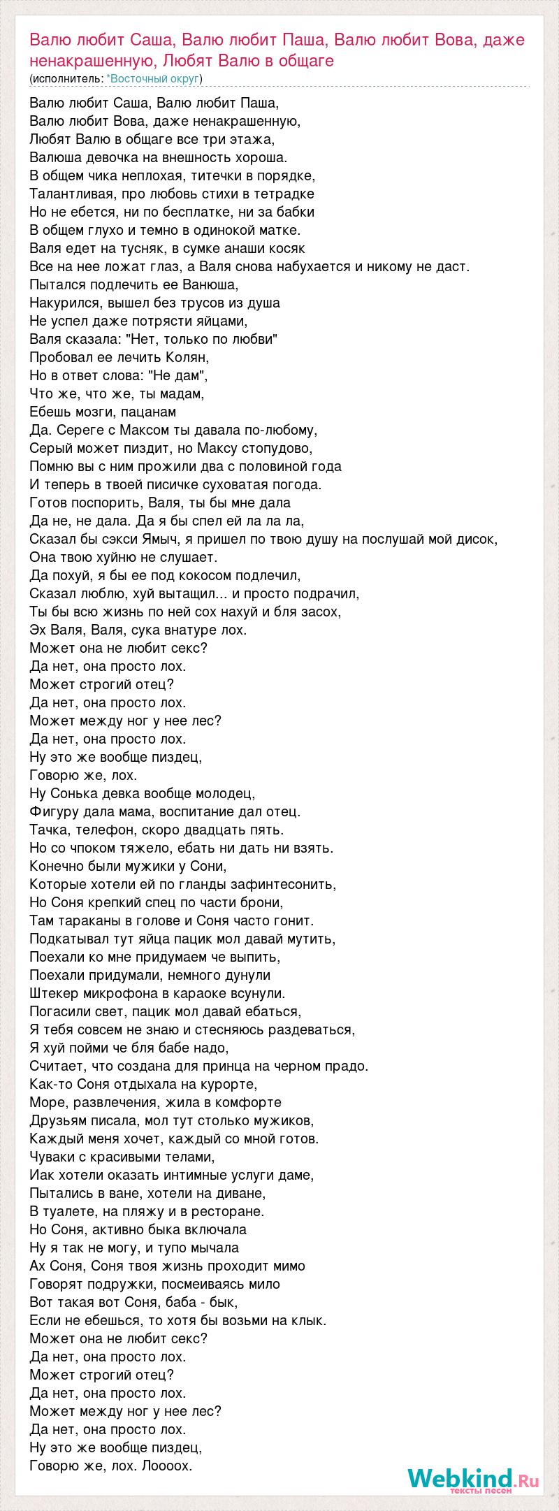 Главная→Исполнители→*Восточный округ→Валю любит Саша, Валю любит Паша, Валю любит Вова, даже ненакрашенную, Любят Ва