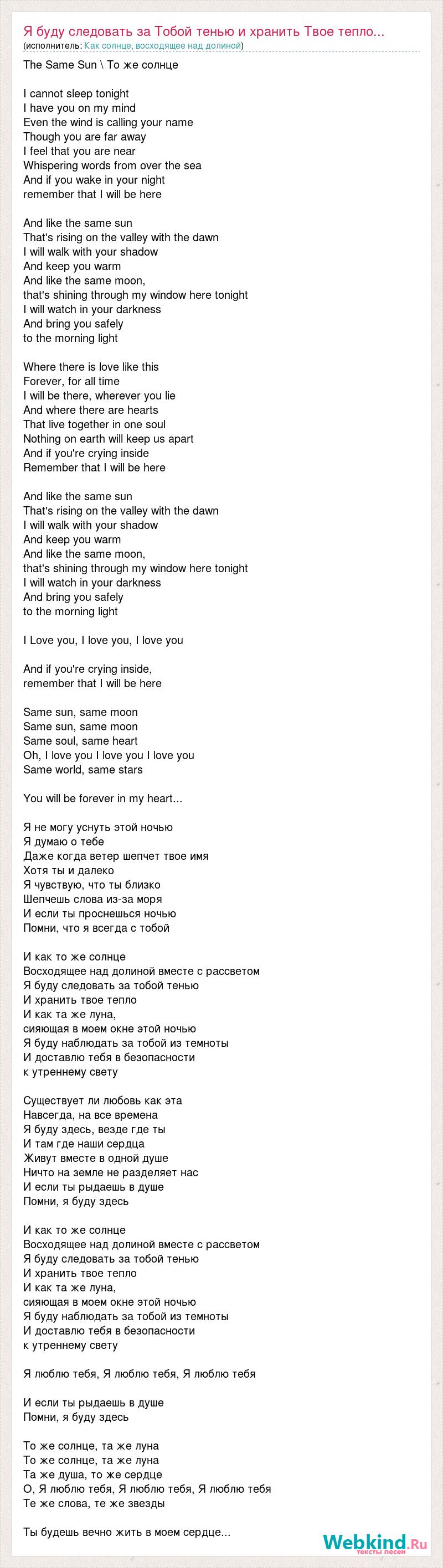 The Same Sun \ То же солнце I cannot sleep tonight I have you on my mind Even the wind is calling your name Though you are far away I feel that you are near Whispering words from over the sea And if you wake in your night remember that I will be here And like the same sun That's rising on the valley with the dawn I will walk with your shadow And keep you warm And like the same moon, that's shining through my window here tonight I will watch in your darkness And bring you safely to the morning light Where there is love like this Forever, for all time I will be there, wherever you lie And where there are hearts That live together in one soul Nothing on earth will keep us apart And if you're crying inside Remember that I will be here And like the same sun That's rising on the valley with the dawn I will walk with your shadow And keep you warm And like the same moon, that's shining through my window here tonight I will watch in your darkness And bring you safely to the morning light I Love you, I love you, I love you And if you're crying inside, remember that I will be here Same sun, same moon Same sun, same moon Same soul, same heart Oh, I love you I love you I love you Same world, same stars You will be forever in my heart... Я не могу уснуть этой ночью Я думаю о тебе Даже когда ветер шепчет твое имя Хотя ты и далеко Я чувствую, что ты близко Шепчешь слова из-за моря И если ты проснешься ночью Помни, что я всегда с тобой И как то же солнце Восходящее над долиной вместе с рассветом Я буду следовать за тобой тенью И хранить твое тепло И как та же луна, сияющая в моем окне этой ночью Я буду наблюдать за тобой из темноты И доставлю тебя в безопасности к утреннему свету Существует ли любовь как эта Навсегда, на все времена Я буду здесь, везде где ты И там где наши сердца Живут вместе в одной душе Ничто на земле не разделяет нас И если ты рыдаешь в душе Помни, я буду здесь И как то же солнце Восходящее над долиной вместе с рассветом Я буду следовать за тобой тенью И хранить твое тепло И как та же луна, сияющая в моем окне этой ночью Я буду наблюдать за тобой из темноты И доставлю тебя в безопасности к утреннему свету Я люблю тебя, Я люблю тебя, Я люблю тебя И если ты рыдаешь в душе Помни, я буду здесь То же солнце, та же луна То же солнце, та же луна Та же душа, то же сердце О, Я люблю тебя, Я люблю тебя, Я люблю тебя Те же слова, те же звезды Ты будешь вечно жить в моем сердце...