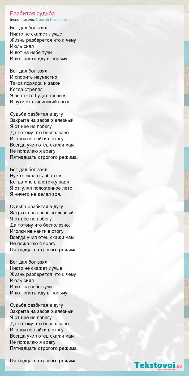 Бог дал бог взял Никто не скажет лучше Жизнь разберется что к чему Июль сиял И вот на небе тучи И вот опять иду в тюрьму. Бог дал бог взял И спорить неуместно Таков порядок и закон Когда стрелял Я знал что будет тесным В пути столыпинский вагон. Судьба разбитая в дугу Закрыта на засов железный Я от нее не побегу Да потому что бесполезно. Иголки не найти в стогу Всегда учил отец скажи мам Не пожелаю я врагу Пятнадцать строгого режима. Бог дал бог взял Ну что сказать об этом Когда мне в клеточку заря Я отгулял положенное лето Я ничего не делал зря. Судьба разбитая в дугу Закрыта на засов железный Я от нее не побегу Да потому что бесполезно. Иголки не найти в стогу Всегда учил отец скажи мам Не пожелаю я врагу Пятнадцать строгого режима. Бог дал бог взял Никто не скажет лучше Жизнь разберется что к чему Июль сиял И вот на небе тучи И вот опять иду в тюрьму. Судьба разбитая в дугу Закрыта на засов железный Я от нее не побегу Да потому что бесполезно. Иголки не найти в стогу Всегда учил отец скажи мам Не пожелаю я врагу Пятнадцать строгого режима. Пятнадцать строгого режима.