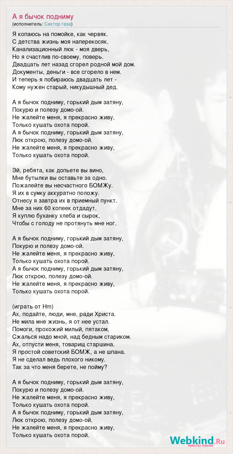 Я копаюсь на помойке, как червяк. С детства жизнь моя наперекосяк. Канализационный люк - моя дверь, Но я счастлив по-своему, поверь. Двадцать лет назад сгорел родной мой дом. Документы, деньги - все сгорело в нем. И теперь я побираюсь двадцать лет - Кому нужен старый, никудышный дед. А я бычок подниму, горький дым затяну, Покурю и полезу домо-ой. Не жалейте меня, я прекрасно живу, Только кушать охота порой. А я бычок подниму, горький дым затяну, Люк открою, полезу домо-ой. Не жалейте меня, я прекрасно живу, Только кушать охота порой. Эй, ребята, как допьете вы вино, Мне бутылки вы оставьте за одно. Пожалейте вы несчастного БОМЖу. Я их в сумку аккуратно положу. Отнесу я завтра их в приемный пункт. Мне за них 60 копеек отдадут. Я куплю буханку хлеба и сырок, Чтобы с голоду не протянуть мне ног. А я бычок подниму, горький дым затяну, Покурю и полезу домо-ой. Не жалейте меня, я прекрасно живу, Только кушать охота порой. А я бычок подниму, горький дым затяну, Люк открою, полезу домо-ой. Не жалейте меня, я прекрасно живу, Только кушать охота порой. (играть от Hm) Ах, подайте, люди, мне, ради Христа. Не мила мне жизнь, я от нее устал. Помоги, прохожий милый, пятаком, Сжалься надо мной, над бедным стариком. Ах, отпусти меня, товарищ старшина. Я простой советский БОМЖ, а не шпана. Я не сделал ведь плохого никому. Так за что меня берете, не пойму? А я бычок подниму, горький дым затяну, Покурю и полезу домо-ой. Не жалейте меня, я прекрасно живу, Только кушать охота порой. А я бычок подниму, горький дым затяну, Люк открою, полезу домо-ой. Не жалейте меня, я прекрасно живу, Только кушать охота порой.