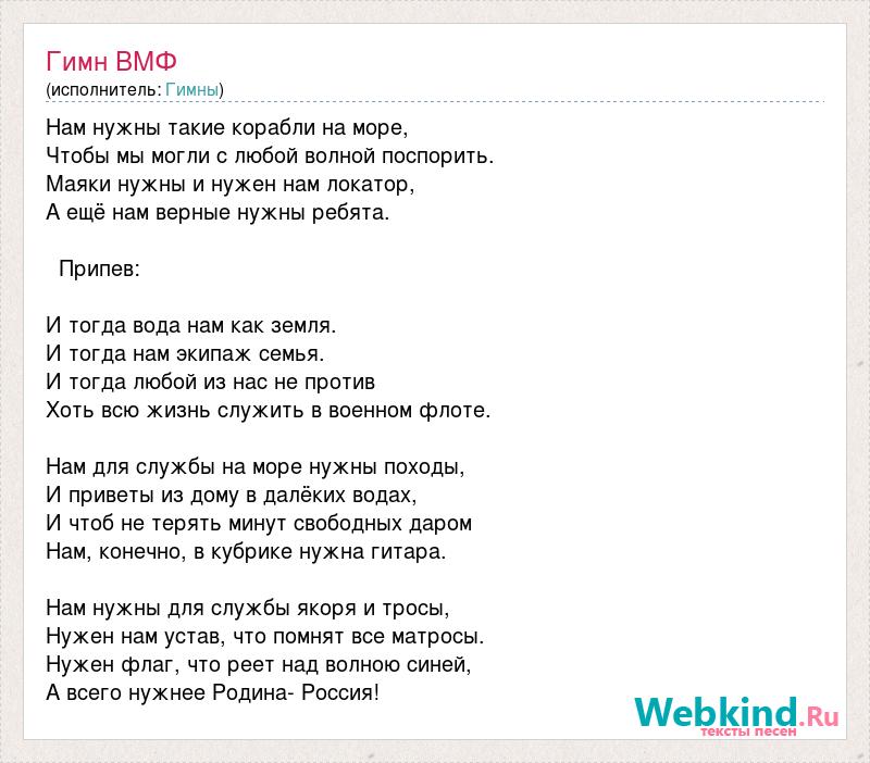Нам нужны такие корабли на море, Чтобы мы могли с любой волной поспорить. Маяки нужны и нужен нам локатор, А ещё нам верные нужны ребята. Припев: И тогда вода нам как земля. И тогда нам экипаж семья. И тогда любой из нас не против Хоть всю жизнь служить в военном флоте. Нам для службы на море нужны походы, И приветы из дому в далёких водах, И чтоб не терять минут свободных даром Нам, конечно, в кубрике нужна гитара. Нам нужны для службы якоря и тросы, Нужен нам устав, что помнят все матросы. Нужен флаг, что реет над волною синей, А всего нужнее Родина- Россия!