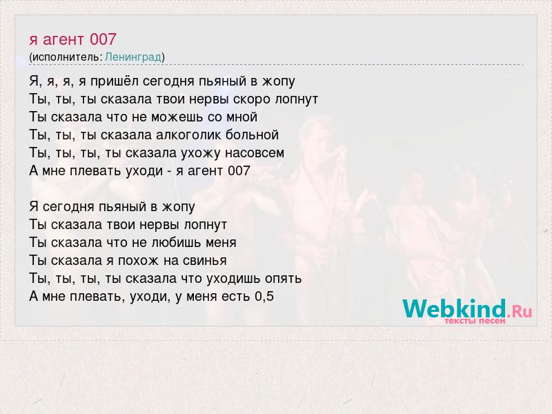 Я, я, я, я пришёл сегодня пьяный в жопу Ты, ты, ты сказала твои нервы скоро лопнут Ты сказала что не можешь со мной Ты, ты, ты сказала алкоголик больной Ты, ты, ты, ты сказала ухожу насовсем А мне плевать уходи - я агент 007 Я сегодня пьяный в жопу Ты сказала твои нервы лопнут Ты сказала что не любишь меня Ты сказала я похож на свинья Ты, ты, ты, ты сказала что уходишь опять А мне плевать, уходи, у меня есть 0,5