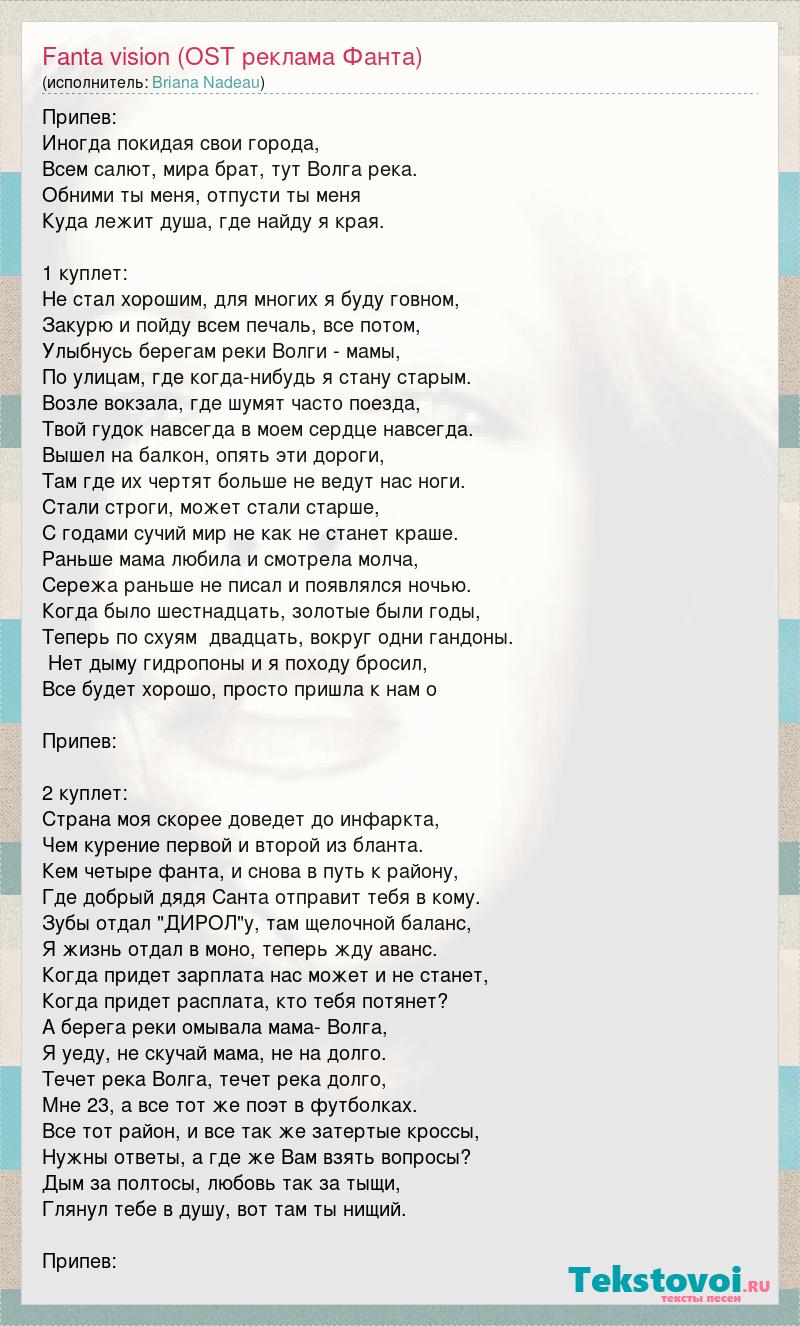 Припев: Иногда покидая свои города, Всем салют, мира брат, тут Волга река. Обними ты меня, отпусти ты меня Куда лежит душа, где найду я края. 1 куплет: Не стал хорошим, для многих я буду говном, Закурю и пойду всем печаль, все потом, Улыбнусь берегам реки Волги - мамы, По улицам, где когда-нибудь я стану старым. Возле вокзала, где шумят часто поезда, Твой гудок навсегда в моем сердце навсегда. Вышел на балкон, опять эти дороги, Там где их чертят больше не ведут нас ноги. Стали строги, может стали старше, С годами сучий мир не как не станет краше. Раньше мама любила и смотрела молча, Сережа раньше не писал и появлялся ночью. Когда было шестнадцать, золотые были годы, Теперь по схуям двадцать, вокруг одни гандоны. Нет дыму гидропоны и я походу бросил, Все будет хорошо, просто пришла к нам о Припев: 2 куплет: Страна моя скорее доведет до инфаркта, Чем курение первой и второй из бланта. Кем четыре фанта, и снова в путь к району, Где добрый дядя Санта отправит тебя в кому. Зубы отдал "ДИРОЛ"у, там щелочной баланс, Я жизнь отдал в моно, теперь жду аванс. Когда придет зарплата нас может и не станет, Когда придет расплата, кто тебя потянет? А берега реки омывала мама- Волга, Я уеду, не скучай мама, не на долго. Течет река Волга, течет река долго, Мне 23, а все тот же поэт в футболках. Все тот район, и все так же затертые кроссы, Нужны ответы, а где же Вам взять вопросы? Дым за полтосы, любовь так за тыщи, Глянул тебе в душу, вот там ты нищий. Припев: