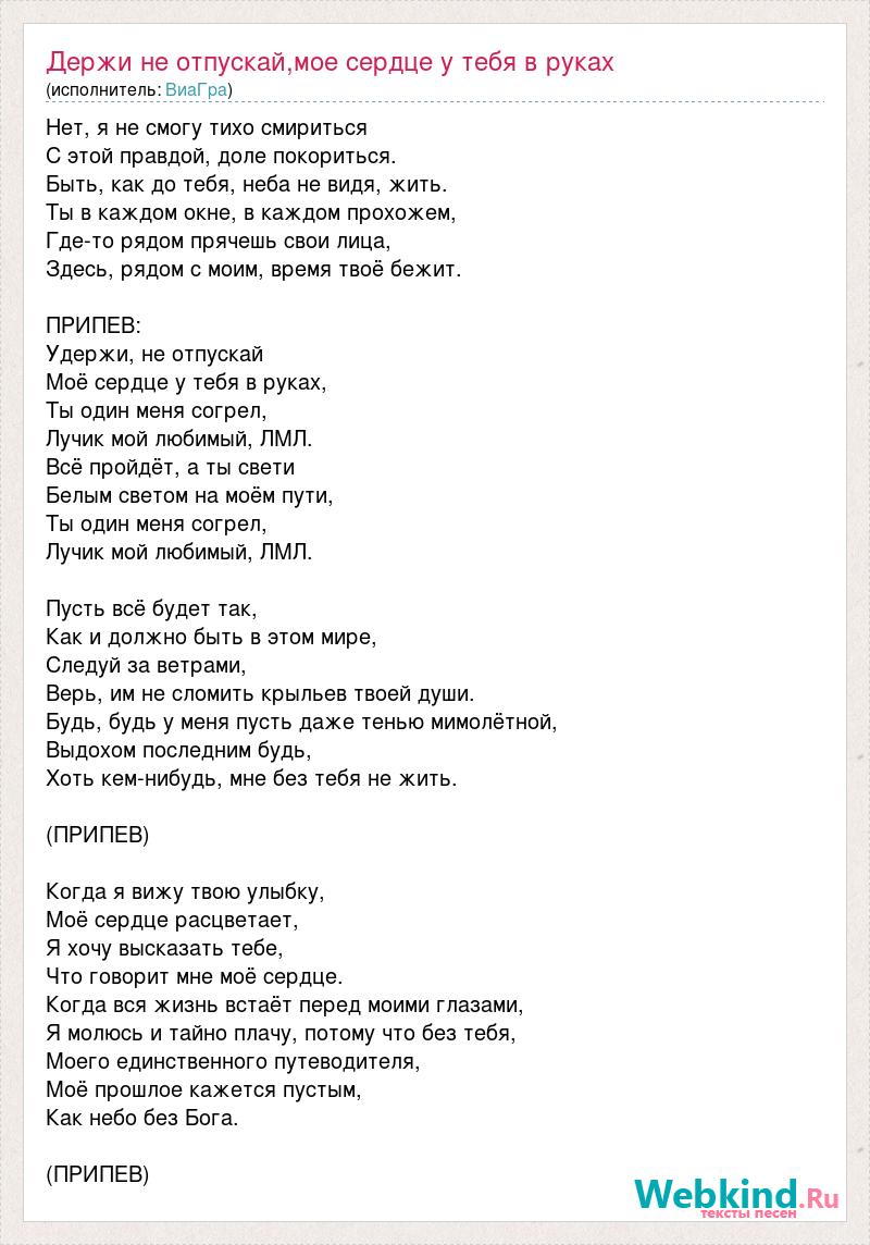 А как ты думаешь, о чем песня "Держи не отпускай,мое сердце у тебя в руках" ?