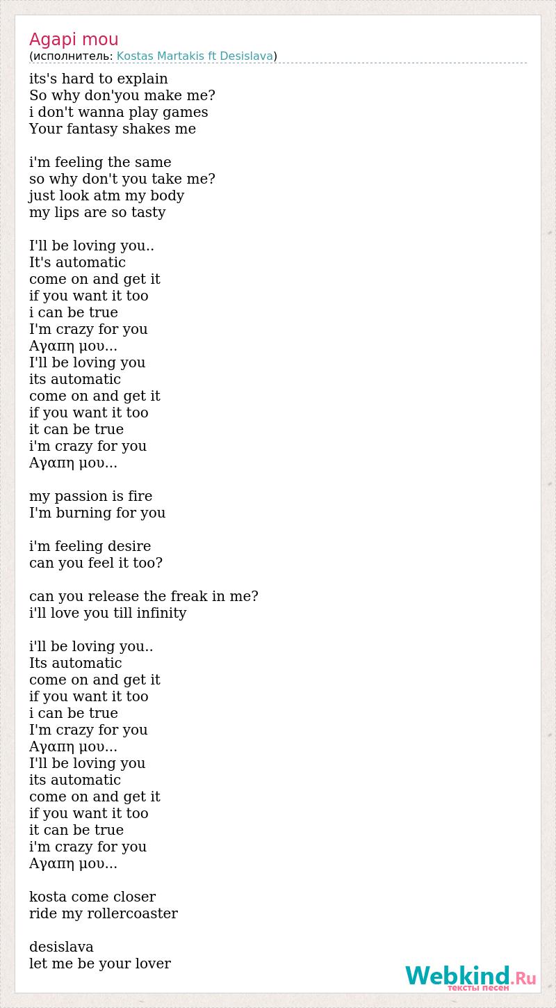 its's hard to explain So why don'you make me? i don't wanna play games Your fantasy shakes me i'm feeling the same so why don't you take me? just look atm my body my lips are so tasty I'll be loving you.. It's automatic come on and get it if you want it too i can be true I'm crazy for you Αγαπη μου... Ι'll be loving you its automatic come on and get it if you want it too it can be true i'm crazy for you Αγαπη μου... my passion is fire I'm burning for you i'm feeling desire can you feel it too? can you release the freak in me? i'll love you till infinity i'll be loving you.. Its automatic come on and get it if you want it too i can be true I'm crazy for you Αγαπη μου... Ι'll be loving you its automatic come on and get it if you want it too it can be true i'm crazy for you Αγαπη μου... kosta come closer ride my rollercoaster desislava let me be your lover
