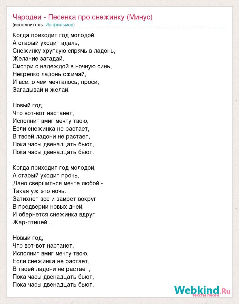 Когда приходит год молодой, А старый уходит вдаль, Снежинку хрупкую спрячь в ладонь, Желание загадай. Смотри с надеждой в ночную синь, Некрепко ладонь сжимай, И все, о чем мечталось, проси, Загадывай и желай. Новый год, Что вот-вот настанет, Исполнит вмиг мечту твою, Если снежинка не растает, В твоей ладони не растает, Пока часы двенадцать бьют, Пока часы двенадцать бьют. Когда приходит год молодой, А старый уходит прочь, Дано свершиться мечте любой - Такая уж это ночь. Затихнет все и замрет вокруг В предверии новых дней, И обернется снежинка вдруг Жар-птицей... Новый год, Что вот-вот настанет, Исполнит вмиг мечту твою, Если снежинка не растает, В твоей ладони не растает, Пока часы двенадцать бьют, Пока часы двенадцать бьют.