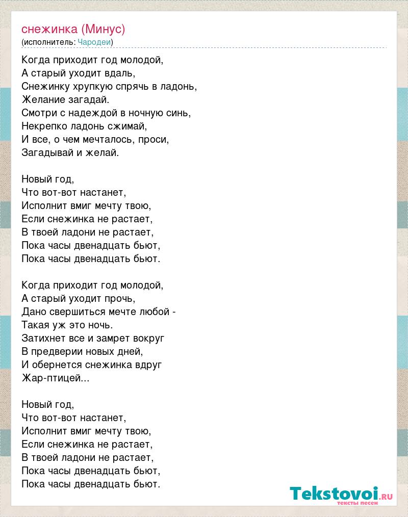 Когда приходит год молодой, А старый уходит вдаль, Снежинку хрупкую спрячь в ладонь, Желание загадай. Смотри с надеждой в ночную синь, Некрепко ладонь сжимай, И все, о чем мечталось, проси, Загадывай и желай. Новый год, Что вот-вот настанет, Исполнит вмиг мечту твою, Если снежинка не растает, В твоей ладони не растает, Пока часы двенадцать бьют, Пока часы двенадцать бьют. Когда приходит год молодой, А старый уходит прочь, Дано свершиться мечте любой - Такая уж это ночь. Затихнет все и замрет вокруг В предверии новых дней, И обернется снежинка вдруг Жар-птицей... Новый год, Что вот-вот настанет, Исполнит вмиг мечту твою, Если снежинка не растает, В твоей ладони не растает, Пока часы двенадцать бьют, Пока часы двенадцать бьют.
