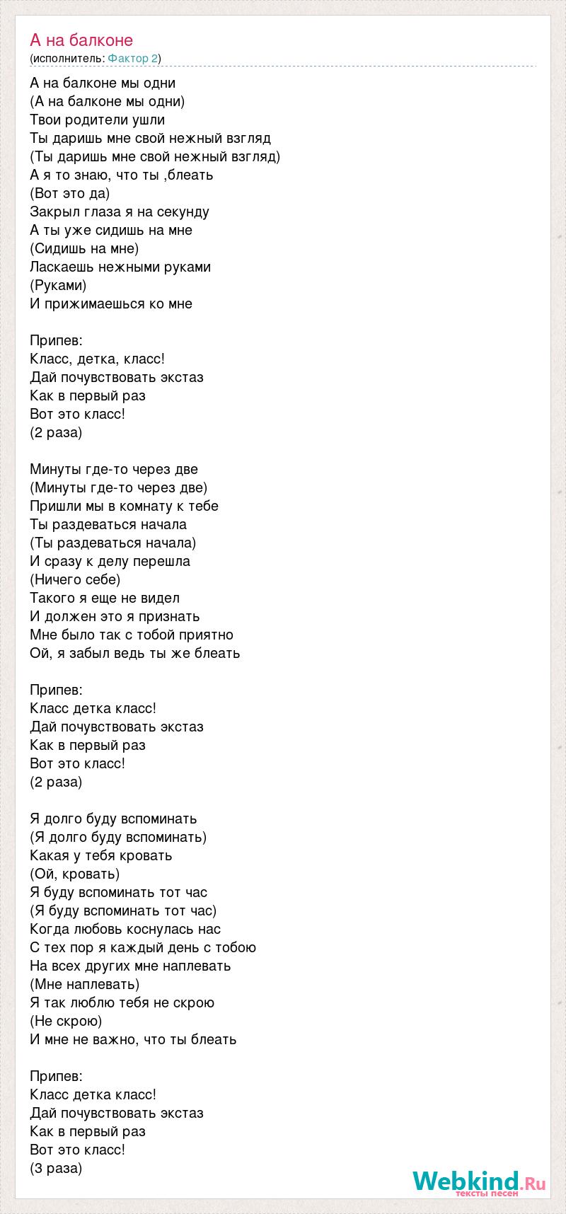 А на балконе мы одни (А на балконе мы одни) Твои родители ушли Ты даришь мне свой нежный взгляд (Ты даришь мне свой нежный взгляд) А я то знаю, что ты ,блеать (Вот это да) Закрыл глаза я на секунду А ты уже сидишь на мне (Сидишь на мне) Ласкаешь нежными руками (Руками) И прижимаешься ко мне Припев: Класс, детка, класс! Дай почувствовать экстаз Как в первый раз Вот это класс! (2 раза) Минуты где-то через две (Минуты где-то через две) Пришли мы в комнату к тебе Ты раздеваться начала (Ты раздеваться начала) И сразу к делу перешла (Ничего себе) Такого я еще не видел И должен это я признать Мне было так с тобой приятно Ой, я забыл ведь ты же блеать Припев: Класс детка класс! Дай почувствовать экстаз Как в первый раз Вот это класс! (2 раза) Я долго буду вспоминать (Я долго буду вспоминать) Какая у тебя кровать (Ой, кровать) Я буду вспоминать тот час (Я буду вспоминать тот час) Когда любовь коснулась нас С тех пор я каждый день с тобою На всех других мне наплевать (Мне наплевать) Я так люблю тебя не скрою (Не скрою) И мне не важно, что ты блеать Припев: Класс детка класс! Дай почувствовать экстаз Как в первый раз Вот это класс! (3 раза)