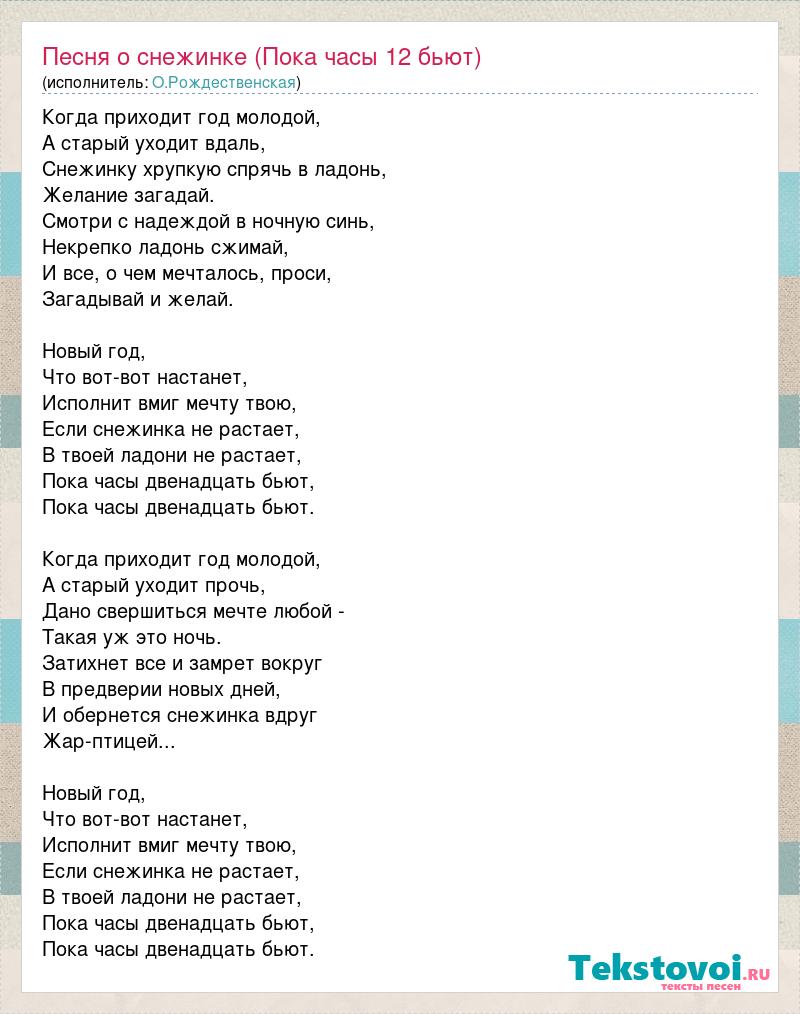 Когда приходит год молодой, А старый уходит вдаль, Снежинку хрупкую спрячь в ладонь, Желание загадай. Смотри с надеждой в ночную синь, Некрепко ладонь сжимай, И все, о чем мечталось, проси, Загадывай и желай. Новый год, Что вот-вот настанет, Исполнит вмиг мечту твою, Если снежинка не растает, В твоей ладони не растает, Пока часы двенадцать бьют, Пока часы двенадцать бьют. Когда приходит год молодой, А старый уходит прочь, Дано свершиться мечте любой - Такая уж это ночь. Затихнет все и замрет вокруг В предверии новых дней, И обернется снежинка вдруг Жар-птицей... Новый год, Что вот-вот настанет, Исполнит вмиг мечту твою, Если снежинка не растает, В твоей ладони не растает, Пока часы двенадцать бьют, Пока часы двенадцать бьют.