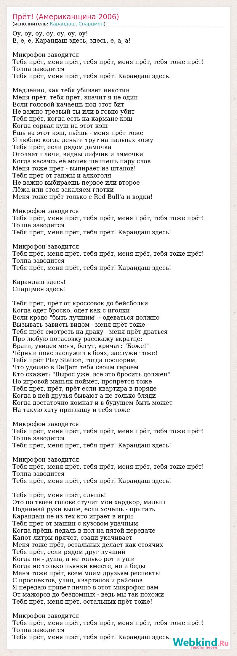 Оу, оу, оу, оу, оу, оу, оу! Е, е, е, Карандаш здесь, здесь, е, а, а! Микрофон заводится Тебя прёт, меня прёт, тебя прёт, меня прёт, тебя тоже прёт! Толпа заводится Тебя прёт, меня прёт, тебя прёт! Карандаш здесь! Медленно, как тебя убивает никотин Меня прёт, тебя прёт, значит я не один Если головой качаешь под этот бит Не важно трезвый ты или в говно убит Тебя прёт, когда есть на кармане кэш Когда сорвал куш на этот кэш Ешь на этот кэш, пьёшь - меня прёт тоже Я люблю когда деньги трут на пальцах кожу Тебя прёт, если рядом дамочка Оголяет плечи, видны лифчик и лямочки Когда касаясь её мочек шепчешь пару слов Меня тоже прёт - выпирает из штанов! Тебя прёт от ганжы и алкоголя Не важно выбираешь первое или второе Лёжа или стоя закаляем глотки Меня тоже прёт только с Red Bull'а и водки! Микрофон заводится Тебя прёт, меня прёт, тебя прёт, меня прёт, тебя тоже прёт! Толпа заводится Тебя прёт, меня прёт, тебя прёт! Карандаш здесь! Микрофон заводится Тебя прёт, меня прёт, тебя прёт, меня прёт, тебя тоже прёт! Толпа заводится Тебя прёт, меня прёт, тебя прёт! Карандаш здесь! Карандаш здесь! Спарцмен здесь! Тебя прёт, прёт от кроссовок до бейсболки Когда одет броско, одет как с иголки Если крэдо "быть лучшим" - одеваться должно Вызывать зависть видом - меня прёт тоже Тебя прёт смотреть на драку - меня прёт драться Про любую потасовку расскажу вкратце: Враги, увидев меня, бегут, кричат: "Боже!" Чёрный пояс заслужил в боях, заслужи тоже! Тебя прёт Play Station, тогда поспорим, Что уделаю в DefJam тебя своим героем Кто скажет: "Вырос уже, всё это бросить должен" Но игровой маньяк поймёт, пропрётся тоже Тебя прёт, прёт, прёт если квартира в поряде Когда в ней друзья бывают а не только бляди Когда достаточно комнат и в будущем быть может На такую хату приглашу и тебя тоже Микрофон заводится Тебя прёт, меня прёт, тебя прёт, меня прёт, тебя тоже прёт! Толпа заводится Тебя прёт, меня прёт, тебя прёт! Карандаш здесь! Микрофон заводится Тебя прёт, меня прёт, тебя прёт, меня прёт, тебя тоже прёт! Толпа заводится Тебя прёт, меня прёт, тебя прёт! Карандаш здесь! Тебя прёт, меня прёт, слышь! Это по твоей голове стучит мой хардкор, малыш Поднимай руки выше, если хочешь - прыгать Карандаш не из тех кто играет в игры Тебя прёт от машин с кузовом удачным Когда прёшь педаль в пол на пятой передаче Капот литры прячет, сзади укачивает Меня тоже прёт, остальных делает как стоячих Тебя прёт, если рядом друг лучший Когда он - душа, а не только рот и уши Когда не только пьянки вместе, но и беды Меня тоже прёт, всем моим друзьям респекты С проспектов, улиц, кварталов и районов Я передаю привет лично в этот микрофон вам От мажоров до бездомных - ведь мы так похожи Тебя прёт, меня прёт, остальных прёт тоже! Микрофон заводится Тебя прёт, меня прёт, тебя прёт, меня прёт, тебя тоже прёт! Толпа заводится Тебя прёт, меня прёт, тебя прёт! Карандаш здесь!