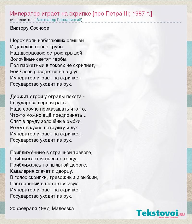 Виктору Сосноре Шорох волн набегающих слышен И далёкое пенье трубы. Над дворцовою острою крышей Золочёные светят гербы. Пол паркетный в покоях не скрипнет, Бой часов раздаётся не вдруг. Император играет на скрипке,- Государство уходит из рук. Держит строй у ограды пехота - Государева верная рать. Надо срочно приказывать что-то,- Что-то можно ещё предпринять... Спят в пруду золочёные рыбки, Режут в кухне петрушку и лук. Император играет на скрипке,- Государство уходит из рук. Приближённые в страшной тревоге, Приближается пьеса к концу, Приближаясь по пыльной дороге, Кавалерия скачет к дворцу. В голос скрипки, тревожный и зыбкий, Посторонний вплетается звук. Император играет на скрипке,- Государство уходит из рук. 20 февраля 1987, Малеевка