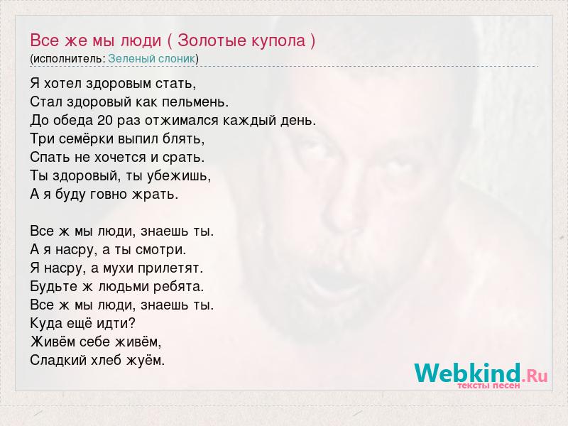 Я хотел здоровым стать, Стал здоровый как пельмень. До обеда 20 раз отжимался каждый день. Три семёрки выпил блять, Спать не хочется и срать. Ты здоровый, ты убежишь, А я буду говно жрать. Все ж мы люди, знаешь ты. А я насру, а ты смотри. Я насру, а мухи прилетят. Будьте ж людьми ребята. Все ж мы люди, знаешь ты. Куда ещё идти? Живём себе живём, Сладкий хлеб жуём.