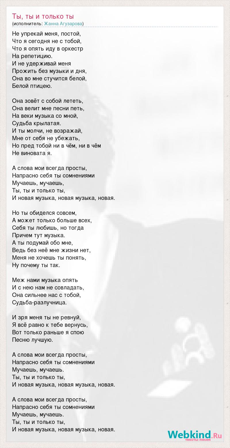 Не упрекай меня, постой, Что я сегодня не с тобой, Что я опять иду в оркестр На репетицию. И не удерживай меня Прожить без музыки и дня, Она во мне стучится белой, Белой птицею. Она зовёт с собой лететь, Она велит мне песни петь, На веки музыка со мной, Судьба крылатая. И ты молчи, не возражай, Мне от себя не убежать, Но пред тобой ни в чём, ни в чём Не виновата я. А слова мои всегда просты, Напрасно себя ты сомнениями Мучаешь, мучаешь, Ты, ты и только ты, И новая музыка, новая музыка, новая. Но ты обиделся совсем, А может только больше всех, Себя ты любишь, но тогда Причем тут музыка. А ты подумай обо мне, Ведь без неё мне жизни нет, Меня не хочешь ты понять, Ну почему ты так. Меж нами музыка опять И с нею нам не совладать, Она сильнее нас с тобой, Судьба-разлучница. И зря меня ты не ревнуй, Я всё равно к тебе вернусь, Вот только раньше я спою Песню лучшую. А слова мои всегда просты, Напрасно себя ты сомнениями Мучаешь, мучаешь. Ты, ты и только ты, И новая музыка, новая музыка, новая. А слова мои всегда просты, Напрасно себя ты сомнениями Мучаешь, мучаешь. Ты, ты и только ты, И новая музыка, новая музыка, новая.
