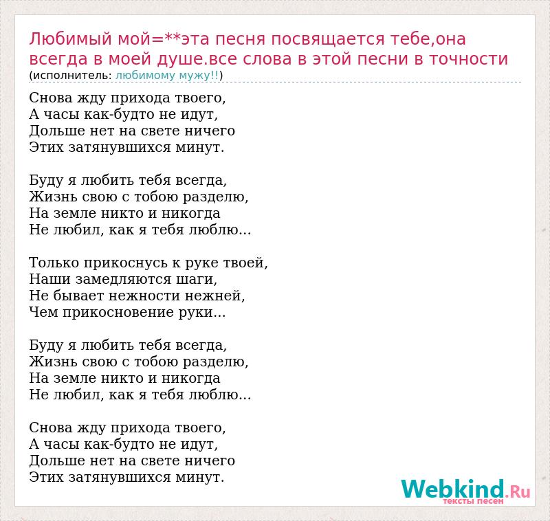 Снова жду прихода твоего, А часы как-будто не идут, Дольше нет на свете ничего Этих затянувшихся минут. Буду я любить тебя всегда, Жизнь свою с тобою разделю, На земле никто и никогда Не любил, как я тебя люблю... Только прикоснусь к руке твоей, Наши замедляются шаги, Не бывает нежности нежней, Чем прикосновение руки... Буду я любить тебя всегда, Жизнь свою с тобою разделю, На земле никто и никогда Не любил, как я тебя люблю... Снова жду прихода твоего, А часы как-будто не идут, Дольше нет на свете ничего Этих затянувшихся минут.