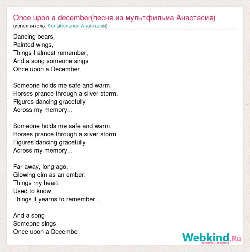 Dancing bears, Painted wings, Things I almost remember, And a song someone sings Once upon a December. Someone holds me safe and warm. Horses prance through a silver storm. Figures dancing gracefully Across my memory... Someone holds me safe and warm. Horses prance through a silver storm. Figures dancing gracefully Across my memory... Far away, long ago, Glowing dim as an ember, Things my heart Used to know, Things it yearns to remember... And a song Someone sings Once upon a Decembe