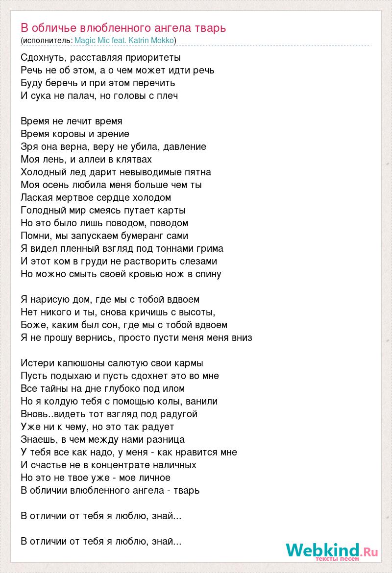 Сдохнуть, расставляя приоритеты Речь не об этом, а о чем может идти речь Буду беречь и при этом перечить И сука не палач, но головы с плеч Время не лечит время Время коровы и зрение Зря она верна, веру не убила, давление Моя лень, и аллеи в клятвах Холодный лед дарит невыводимые пятна Моя осень любила меня больше чем ты Лаская мертвое сердце холодом Голодный мир смеясь путает карты Но это было лишь поводом, поводом Помни, мы запускаем бумеранг сами Я видел пленный взгляд под тоннами грима И этот ком в груди не растворить слезами Но можно смыть своей кровью нож в спину Я нарисую дом, где мы с тобой вдвоем Нет никого и ты, снова кричишь с высоты, Боже, каким был сон, где мы с тобой вдвоем Я не прошу вернись, просто пусти меня меня вниз Истери капюшоны салютую свои кармы Пусть подыхаю и пусть сдохнет это во мне Все тайны на дне глубоко под илом Но я колдую тебя с помощью колы, ванили Вновь..видеть тот взгляд под радугой Уже ни к чему, но это так радует Знаешь, в чем между нами разница У тебя все как надо, у меня - как нравится мне И счастье не в концентрате наличных Но это не твое уже - мое личное В обличии влюбленного ангела - тварь В отличии от тебя я люблю, знай... В отличии от тебя я люблю, знай...