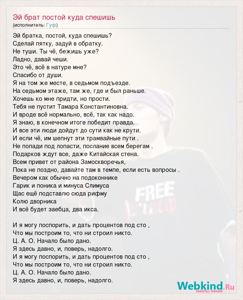 Эй братка, постой, куда спешишь? Сделай пятку, задуй в обратку. Не туши. Ты чё, бежишь уже? Ладно, давай чеши. Это чё, всё в натуре мне? Спасибо от души. Я на том же месте, в седьмом подъезде. На седьмом этаже, там же, где и был раньше. Хочешь ко мне придти, но прости. Тебя не пустит Тамара Константиновна. И вроде всё нормально, всё, так как надо. Я знаю, в конечном итоге победит правда. И все эти люди дойдут до сути как не крути. И если чё, им шепнут эти трамвайные пути . Не попади под лопасти, послание всем берегам . Подарков ждут все, даже Китайская стена. Всем привет от района Замоскворечья, Пока не поздно, давайте там в темпе, если есть вопросы . Вечером как обычно на подоконнике Гарик и поника и минуса Слимуса Щас ещё подставлю сюда рифму Колю дворника И всё будет заебца, два икса. И я могу поспорить, и дать процентов под сто , Что мы построим то, что ни строил никто. Ц. А. О. Начало было дано. Я здесь давно, и, поверь, надолго. И я могу поспорить, и дать процентов под сто , Что мы построим то, что ни строил никто. Ц. А. О. Начало было дано. Я здесь давно, и, поверь, надолго.