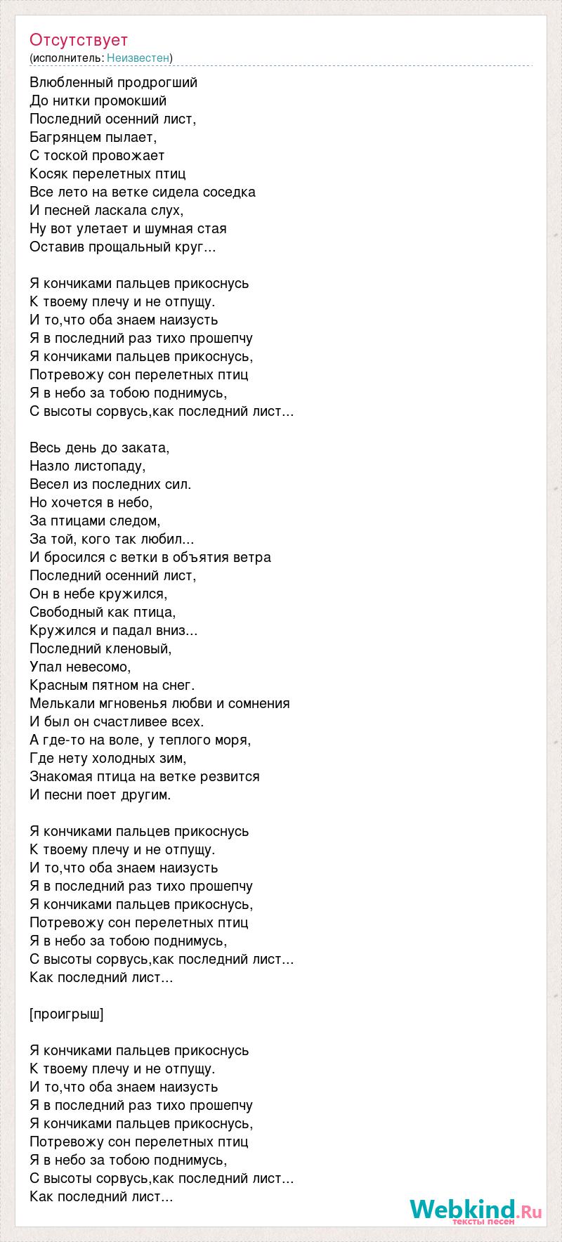 Влюбленный продрогший До нитки промокший Последний осенний лист, Багрянцем пылает, С тоской провожает Косяк перелетных птиц Все лето на ветке сидела соседка И песней ласкала слух, Ну вот улетает и шумная стая Оставив прощальный круг... Я кончиками пальцев прикоснусь К твоему плечу и не отпущу. И то,что оба знаем наизусть Я в последний раз тихо прошепчу Я кончиками пальцев прикоснусь, Потревожу сон перелетных птиц Я в небо за тобою поднимусь, С высоты сорвусь,как последний лист... Весь день до заката, Назло листопаду, Весел из последних сил. Но хочется в небо, За птицами следом, За той, кого так любил... И бросился с ветки в объятия ветра Последний осенний лист, Он в небе кружился, Свободный как птица, Кружился и падал вниз... Последний кленовый, Упал невесомо, Красным пятном на снег. Мелькали мгновенья любви и сомнения И был он счастливее всех. А где-то на воле, у теплого моря, Где нету холодных зим, Знакомая птица на ветке резвится И песни поет другим. Я кончиками пальцев прикоснусь К твоему плечу и не отпущу. И то,что оба знаем наизусть Я в последний раз тихо прошепчу Я кончиками пальцев прикоснусь, Потревожу сон перелетных птиц Я в небо за тобою поднимусь, С высоты сорвусь,как последний лист... Как последний лист... [проигрыш] Я кончиками пальцев прикоснусь К твоему плечу и не отпущу. И то,что оба знаем наизусть Я в последний раз тихо прошепчу Я кончиками пальцев прикоснусь, Потревожу сон перелетных птиц Я в небо за тобою поднимусь, С высоты сорвусь,как последний лист... Как последний лист...