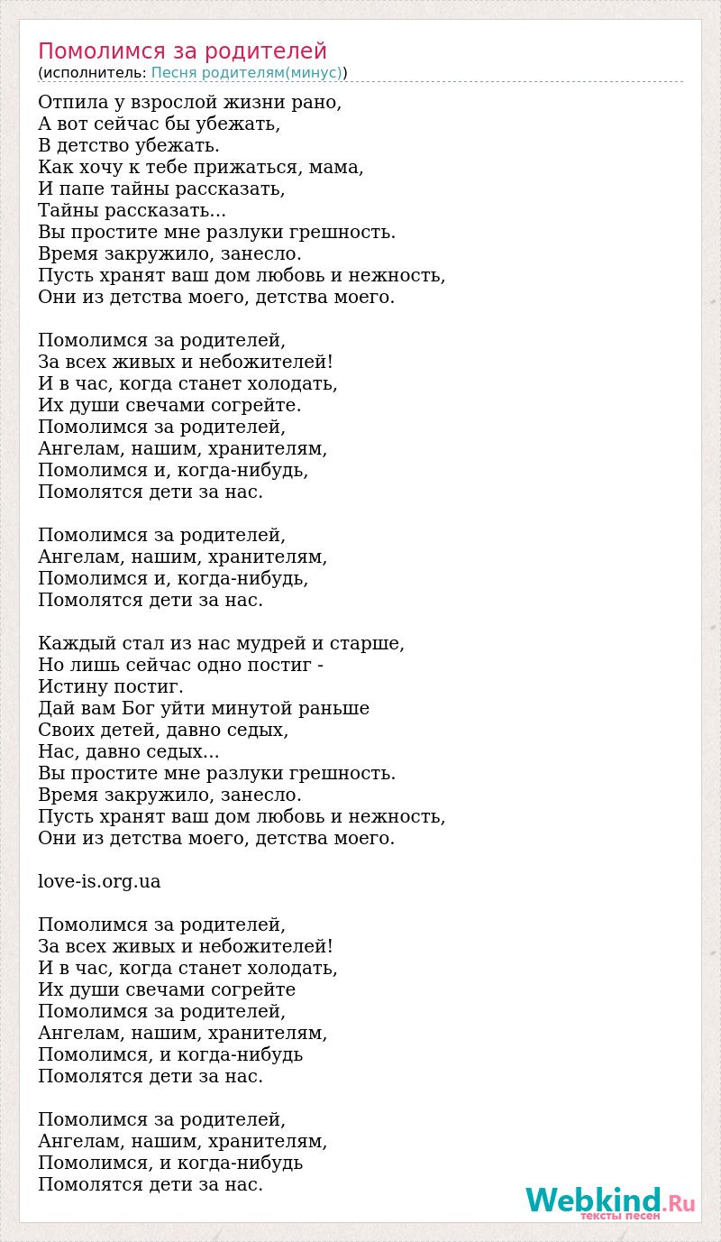 Отпила у взрослой жизни рано, А вот сейчас бы убежать, В детство убежать. Как хочу к тебе прижаться, мама, И папе тайны рассказать, Тайны рассказать... Вы простите мне разлуки грешность. Время закружило, занесло. Пусть хранят ваш дом любовь и нежность, Они из детства моего, детства моего. Помолимся за родителей, За всех живых и небожителей! И в час, когда станет холодать, Их души свечами согрейте. Помолимся за родителей, Ангелам, нашим, хранителям, Помолимся и, когда-нибудь, Помолятся дети за нас. Помолимся за родителей, Ангелам, нашим, хранителям, Помолимся и, когда-нибудь, Помолятся дети за нас. Каждый стал из нас мудрей и старше, Но лишь сейчас одно постиг - Истину постиг. Дай вам Бог уйти минутой раньше Своих детей, давно седых, Нас, давно седых... Вы простите мне разлуки грешность. Время закружило, занесло. Пусть хранят ваш дом любовь и нежность, Они из детства моего, детства моего. love-is.org.ua Помолимся за родителей, За всех живых и небожителей! И в час, когда станет холодать, Их души свечами согрейте Помолимся за родителей, Ангелам, нашим, хранителям, Помолимся, и когда-нибудь Помолятся дети за нас. Помолимся за родителей, Ангелам, нашим, хранителям, Помолимся, и когда-нибудь Помолятся дети за нас.