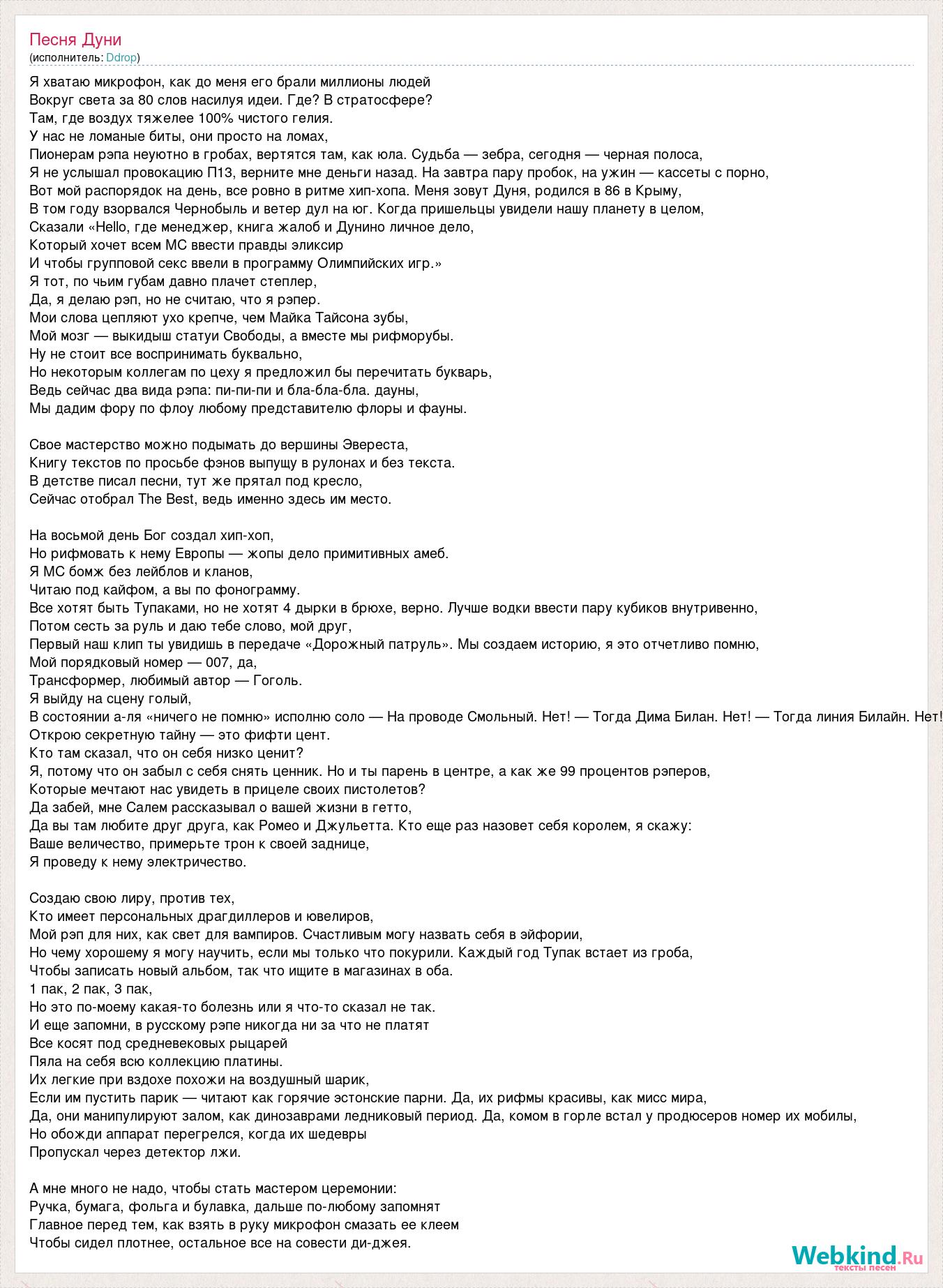 Я хватаю микрофон, как до меня его брали миллионы людей Вокруг света за 80 слов насилуя идеи. Где? В стратосфере? Там, где воздух тяжелее 100% чистого гелия. У нас не ломаные биты, они просто на ломах, Пионерам рэпа неуютно в гробах, вертятся там, как юла. Судьба — зебра, сегодня — черная полоса, Я не услышал провокацию П13, верните мне деньги назад. На завтра пару пробок, на ужин — кассеты с порно, Вот мой распорядок на день, все ровно в ритме хип-хопа. Меня зовут Дуня, родился в 86 в Крыму, В том году взорвался Чернобыль и ветер дул на юг. Когда пришельцы увидели нашу планету в целом, Сказали «Hello, где менеджер, книга жалоб и Дунино личное дело, Который хочет всем МС ввести правды эликсир И чтобы групповой секс ввели в программу Олимпийских игр.» Я тот, по чьим губам давно плачет степлер, Да, я делаю рэп, но не считаю, что я рэпер. Мои слова цепляют ухо крепче, чем Майка Тайсона зубы, Мой мозг — выкидыш статуи Свободы, а вместе мы рифморубы. Ну не стоит все воспринимать буквально, Но некоторым коллегам по цеху я предложил бы перечитать букварь, Ведь сейчас два вида рэпа: пи-пи-пи и бла-бла-бла. дауны, Мы дадим фору по флоу любому представителю флоры и фауны. Свое мастерство можно подымать до вершины Эвереста, Книгу текстов по просьбе фэнов выпущу в рулонах и без текста. В детстве писал песни, тут же прятал под кресло, Сейчас отобрал The Best, ведь именно здесь им место. На восьмой день Бог создал хип-хоп, Но рифмовать к нему Европы — жопы дело примитивных амеб. Я МС бомж без лейблов и кланов, Читаю под кайфом, а вы по фонограмму. Все хотят быть Тупаками, но не хотят 4 дырки в брюхе, верно. Лучше водки ввести пару кубиков внутривенно, Потом сесть за руль и даю тебе слово, мой друг, Первый наш клип ты увидишь в передаче «Дорожный патруль». Мы создаем историю, я это отчетливо помню, Мой порядковый номер — 007, да, Трансформер, любимый автор — Гоголь. Я выйду на сцену голый, В состоянии а-ля «ничего не помню» исполню соло — На проводе Смольный. Нет! — Тогда Дима Билан. Нет! — Тогда линия Билайн. Нет! Открою секретную тайну — это фифти цент. Кто там сказал, что он себя низко ценит? Я, потому что он забыл с себя снять ценник. Но и ты парень в центре, а как же 99 процентов рэперов, Которые мечтают нас увидеть в прицеле своих пистолетов? Да забей, мне Салем рассказывал о вашей жизни в гетто, Да вы там любите друг друга, как Ромео и Джульетта. Кто еще раз назовет себя королем, я скажу: Ваше величество, примерьте трон к своей заднице, Я проведу к нему электричество. Создаю свою лиру, против тех, Кто имеет персональных драгдиллеров и ювелиров, Мой рэп для них, как свет для вампиров. Счастливым могу назвать себя в эйфории, Но чему хорошему я могу научить, если мы только что покурили. Каждый год Тупак встает из гроба, Чтобы записать новый альбом, так что ищите в магазинах в оба. 1 пак, 2 пак, 3 пак, Но это по-моему какая-то болезнь или я что-то сказал не так. И еще запомни, в русскому рэпе никогда ни за что не платят Все косят под средневековых рыцарей Пяла на себя всю коллекцию платины. Их легкие при вздохе похожи на воздушный шарик, Если им пустить парик — читают как горячие эстонские парни. Да, их рифмы красивы, как мисс мира, Да, они манипулируют залом, как динозаврами ледниковый период. Да, комом в горле встал у продюсеров номер их мобилы, Но обожди аппарат перегрелся, когда их шедевры Пропускал через детект