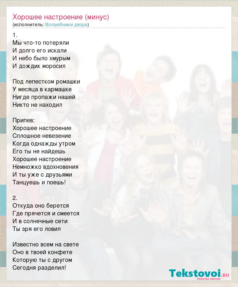 1. Мы что-то потеряли И долго его искали И небо было хмурым И дождик моросил Под лепестком ромашки У месяца в кармашке Нигде пропажи нашей Никто не находил Припев: Хорошее настроение Сплошное невезение Когда однажды утром Его ты не найдешь Хорошее настроение Немножко вдохновения И ты уже с друзьями Танцуешь и поешь! 2. Откуда оно берется Где прячется и смеется И в солнечные сети Ты зря его ловил Известно всем на свете Оно в твоей конфете Которую ты с другом Сегодня разделил!