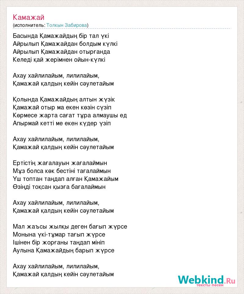 Басында Қамажайдың бір тал үкі Айрылып Қамажайдан болдым күлкі Айрылып Қамажайдан отырғанда Келеді қай жерімнен ойын-күлкі Ахау хайлилайым, лилилайым, Қамажай қалдың кейін сәулетайым Қолында Қамажайдың алтын жүзік Қамажай отыр ма екен көзін сүзіп Көрмесе жарта сағат тұра алмаушы ед Апырмай кетті ме екен күдер үзіп Ахау хайлилайым, лилилайым, Қамажай қалдың кейін сәулетайым Ертістің жағалауын жағалаймын Мұз болса көк бестіні тағалаймын Үш топтан таңдап алған Қамажайым Өзіңді тоқсан қызға бағалаймын Ахау хайлилайым, лилилайым, Қамажай қалдың кейін сәулетайым Мал жаъсы жылқы деген бағып жүрсе Монына үкі-тұмар тағып жүрсе Ішінен бір жорғаны таңдап мініп Аулына Қамажайдың барып жүрсе Ахау хайлилайым, лилилайым, Қамажай қалдың кейін сәулетайым